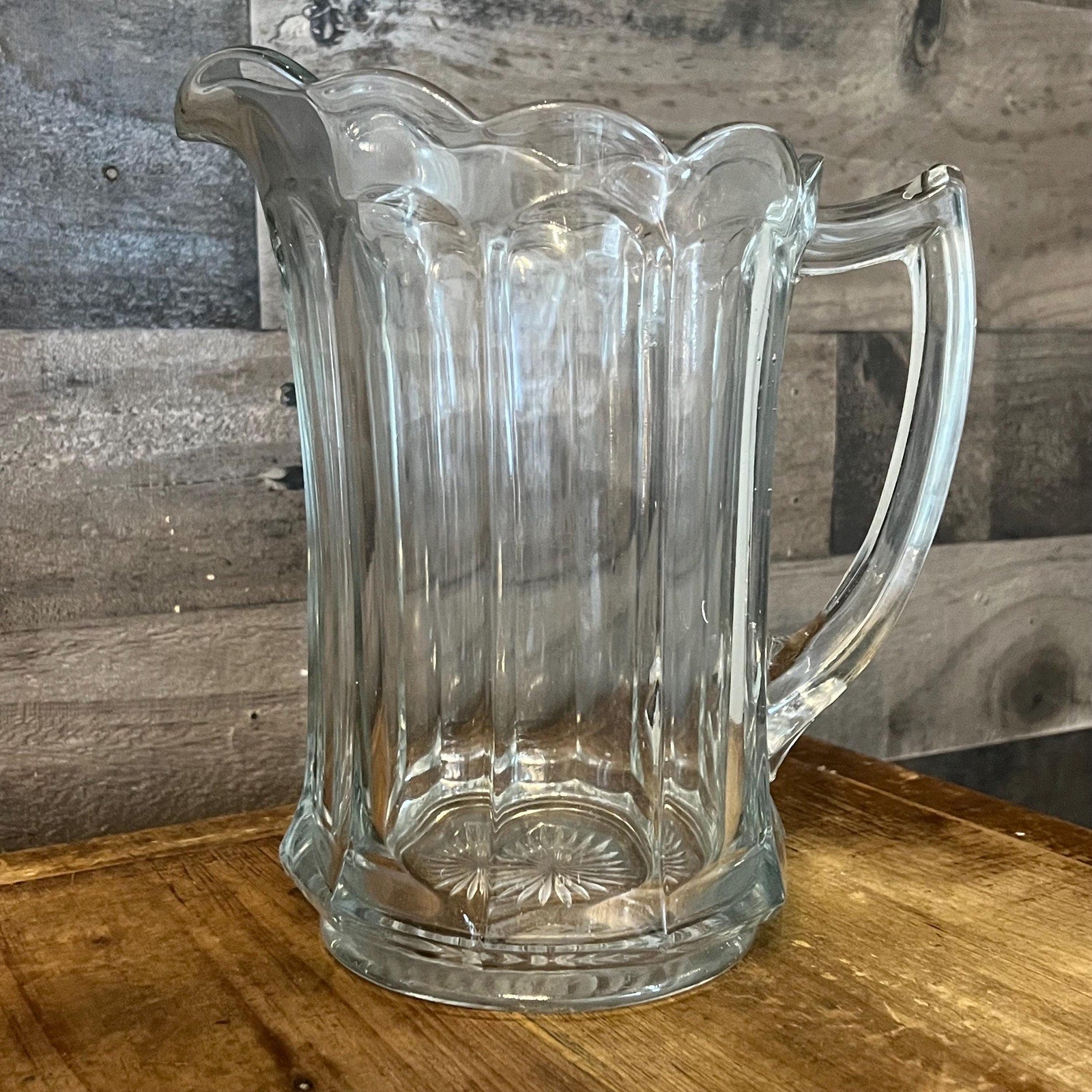 This Antique Clear Imperial Glass Pure Colonial Scallop Rim Handled Pitcher will look wonderful in your space! It’s lovely for serving up your favorite drink of choice, water, lemonade, juice, iced tea, cocktails and more! Measures about 8 1/2 inch tall x 8 inch wide x 5 1/2 inch deep. There is a small chip on the handle - pictured - this does not effect its use as an antique pitcher!
