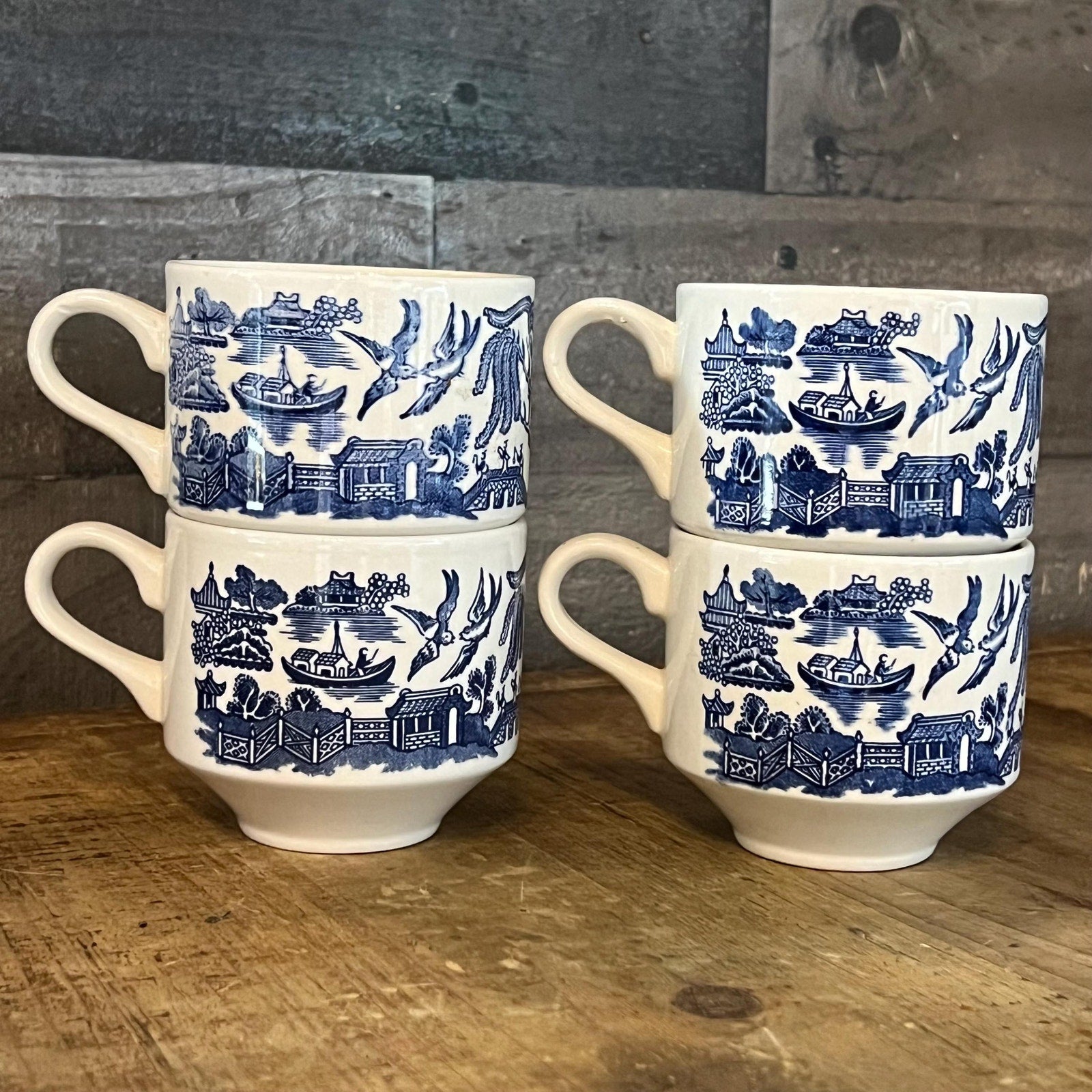 This Churchill England Blue Willow Tea Cups - Set of 4 will look lovely in your space! They’re wonderful for serving up your favorite tea of choice! They’re great as a set of their own as well as an addition to an existing set. Stackable. Each measures about 2 7/8 inch tall x 4 inch wide with handle x 3 inch deep