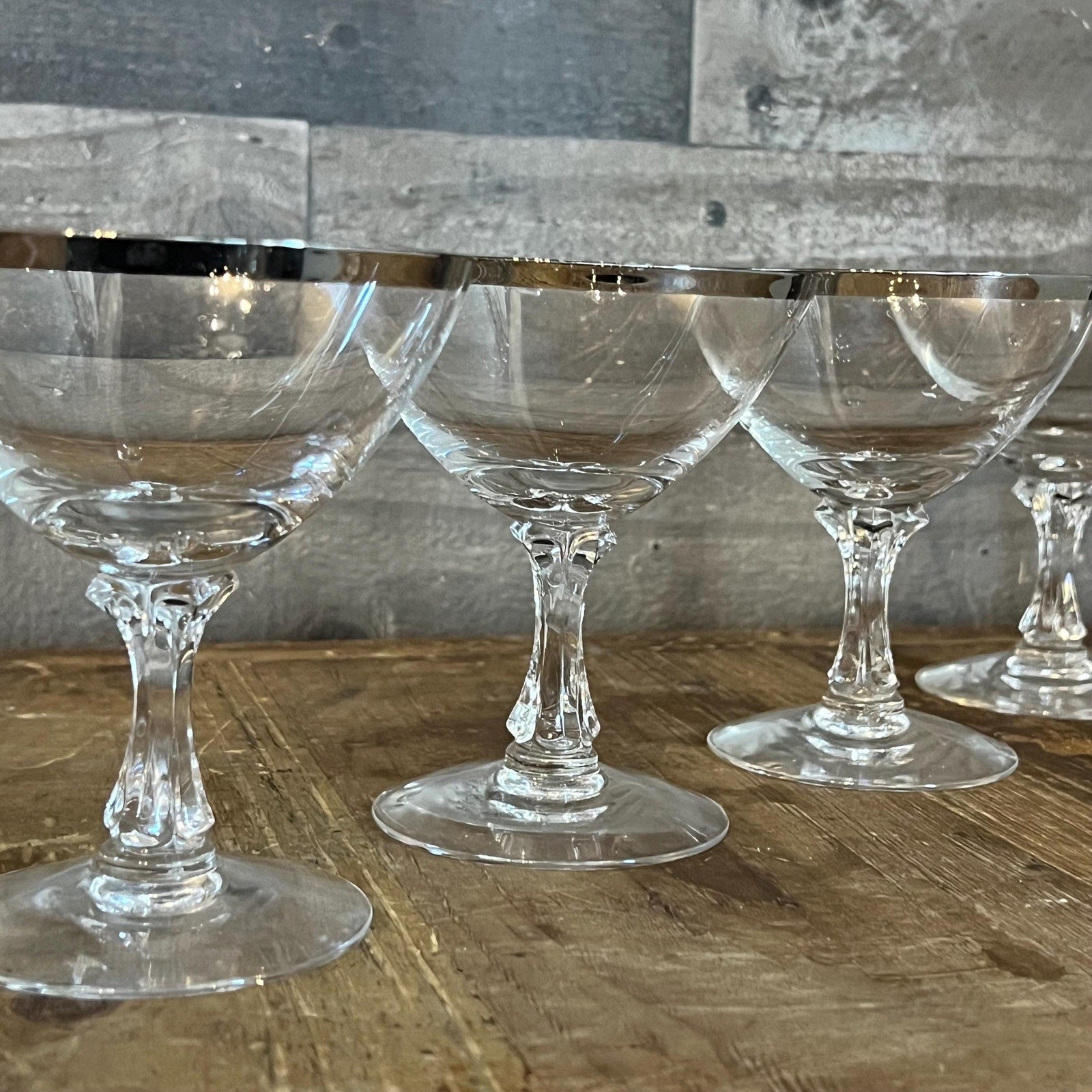 These Fostoria Wedding Ring Champagne Glasses - Tall Sherbet Glasses - Set of 6 will look wonderful in your space! Each glass features a silver accent along the rim. Each glass measures about 4 1/2 inch tall x 4 inch wide
