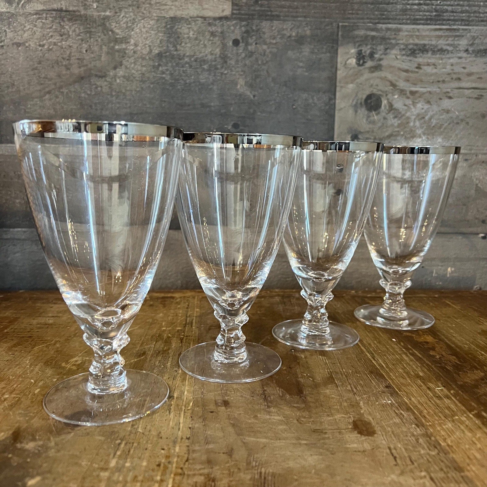 These Fostoria Wedding Ring Iced Tea Glasses - Set of 4 will look amazing on your tabletop! Perfect for serving up iced tea, water, juice or your favorite drink of choice! Each glass features a silver tone rim along the edge. Each glass measures about 3 1/2 inch wide x 6 inch tall