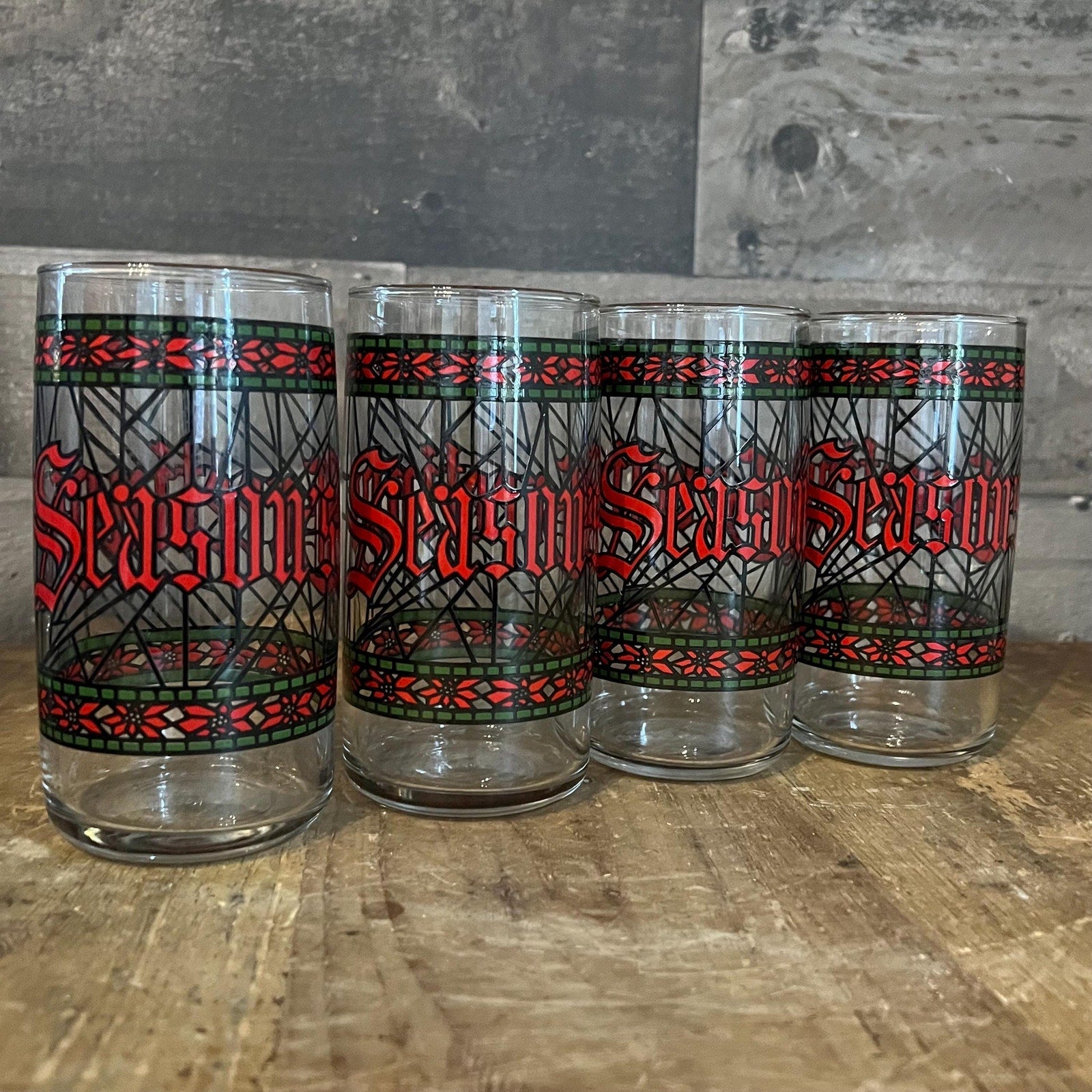 These Houze Glass Company Seasons Greetings Tall Juice Glasses - Christmas Holiday Glassware - Set of 4 will look wonderful in your space! Each glass features a red, green and black stained glass design that reads Seasons Greetings with a poinsettia border. Each glass measures about 5 inch tall x 2 1/2 inch wide