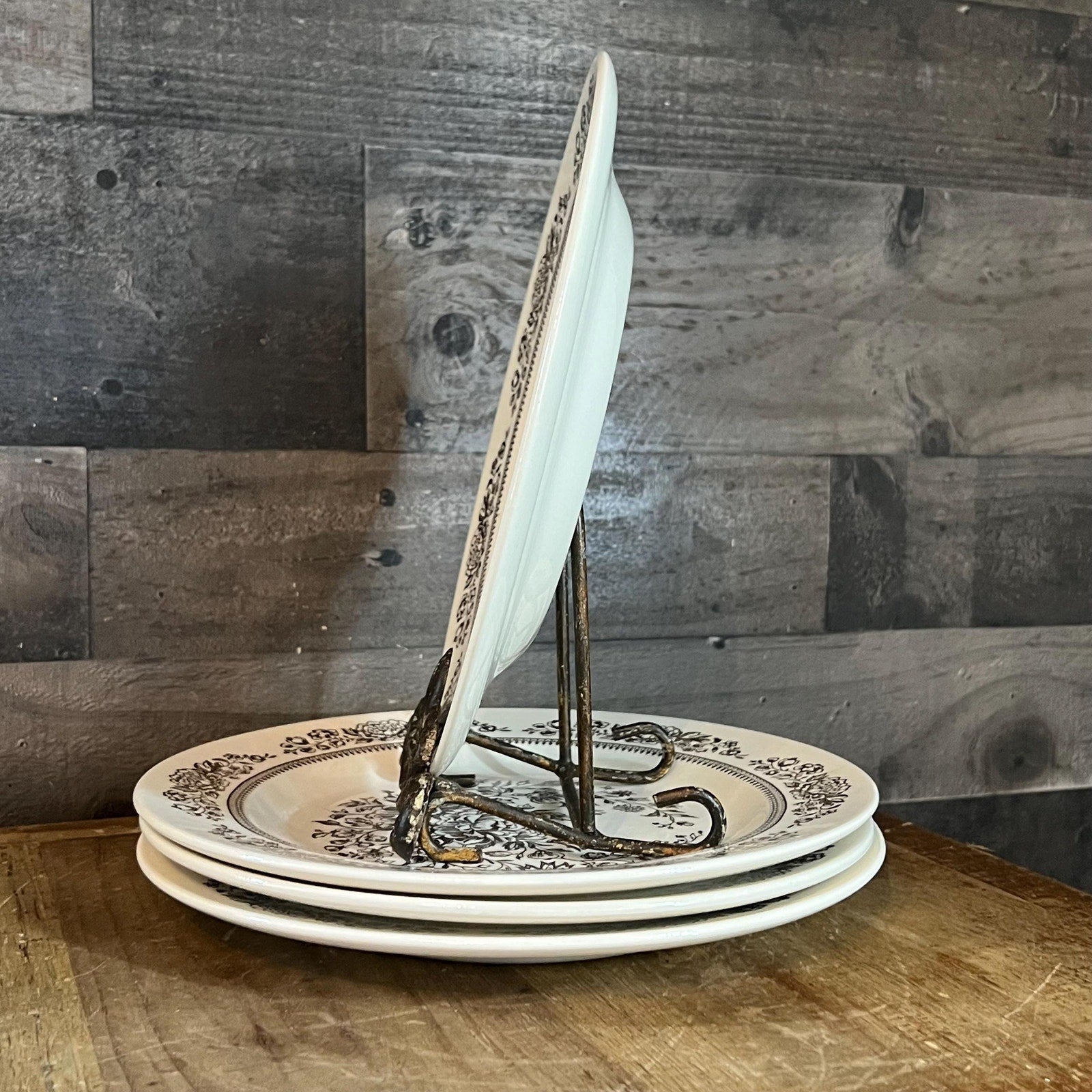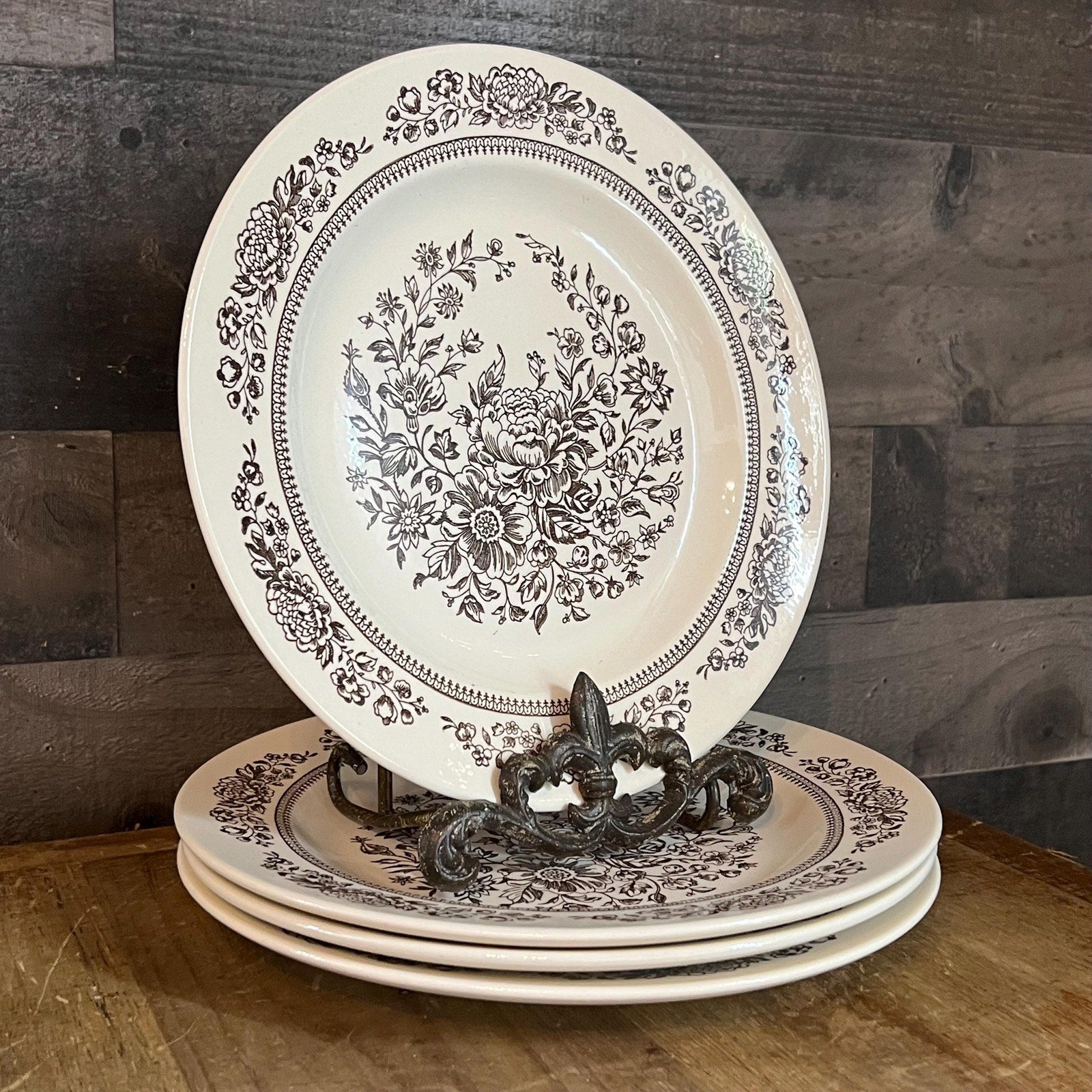 These Royal USA Sussex Cavalier Ironstone Brown and White Floral Dinner Plates - Set of 4 will look amazing on your tabletop! Also wonderful for use as a plate wall. Each measures about 10 inch wide.