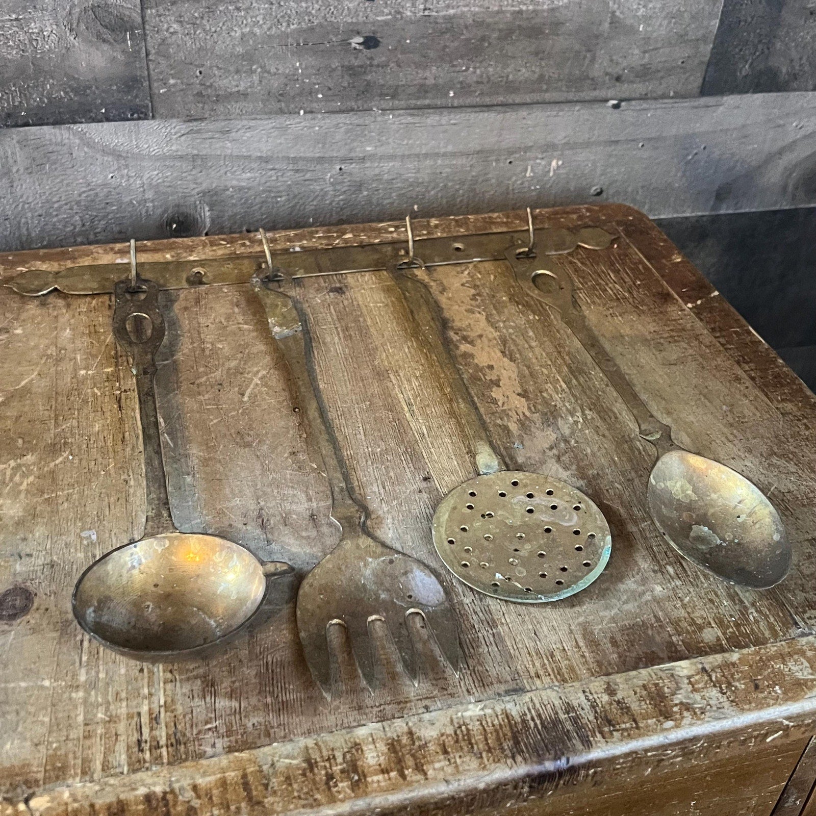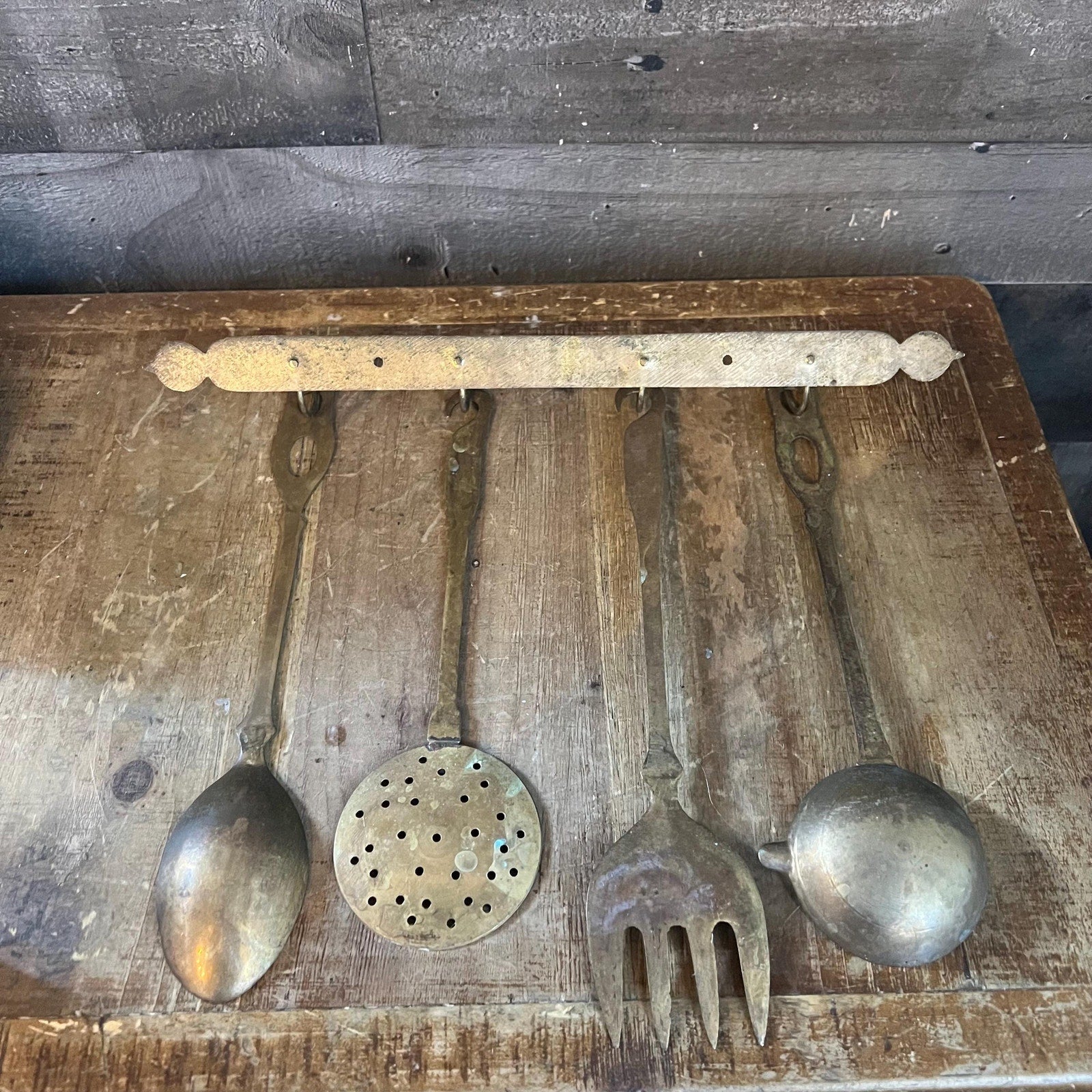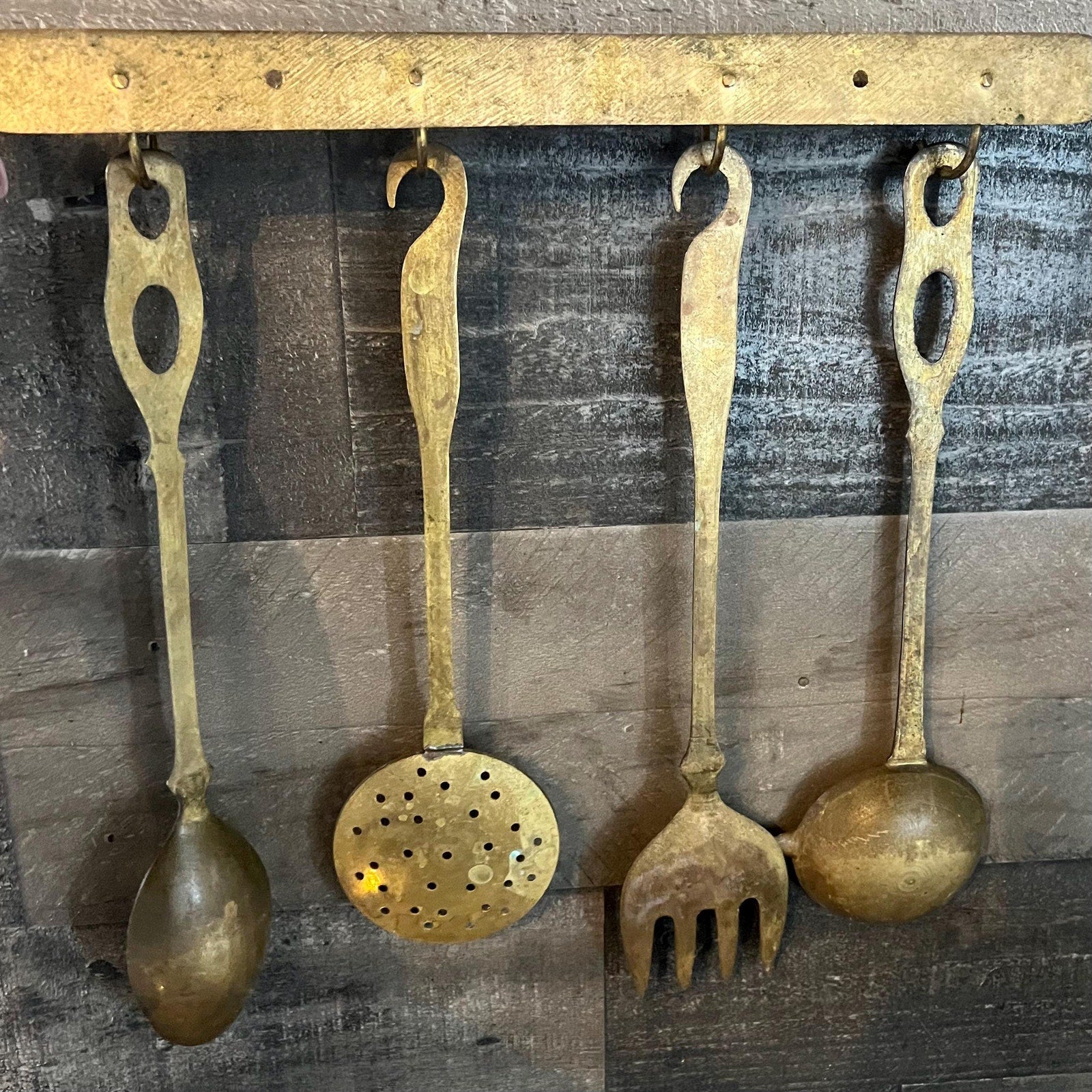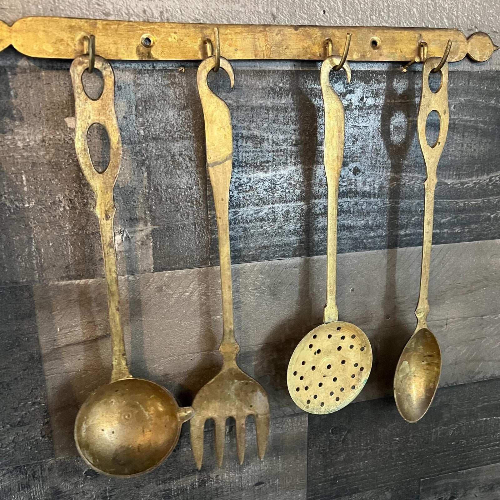 This Solid Brass Serving Utensil Set with Wall Mounted Holder will look amazing in your space! Includes ladle with spout, fork, strainer, spoon and holder with hooks! Holder with hooks measures about 15 inch wide x utensils measure about 10 1/2 - 12 inch long