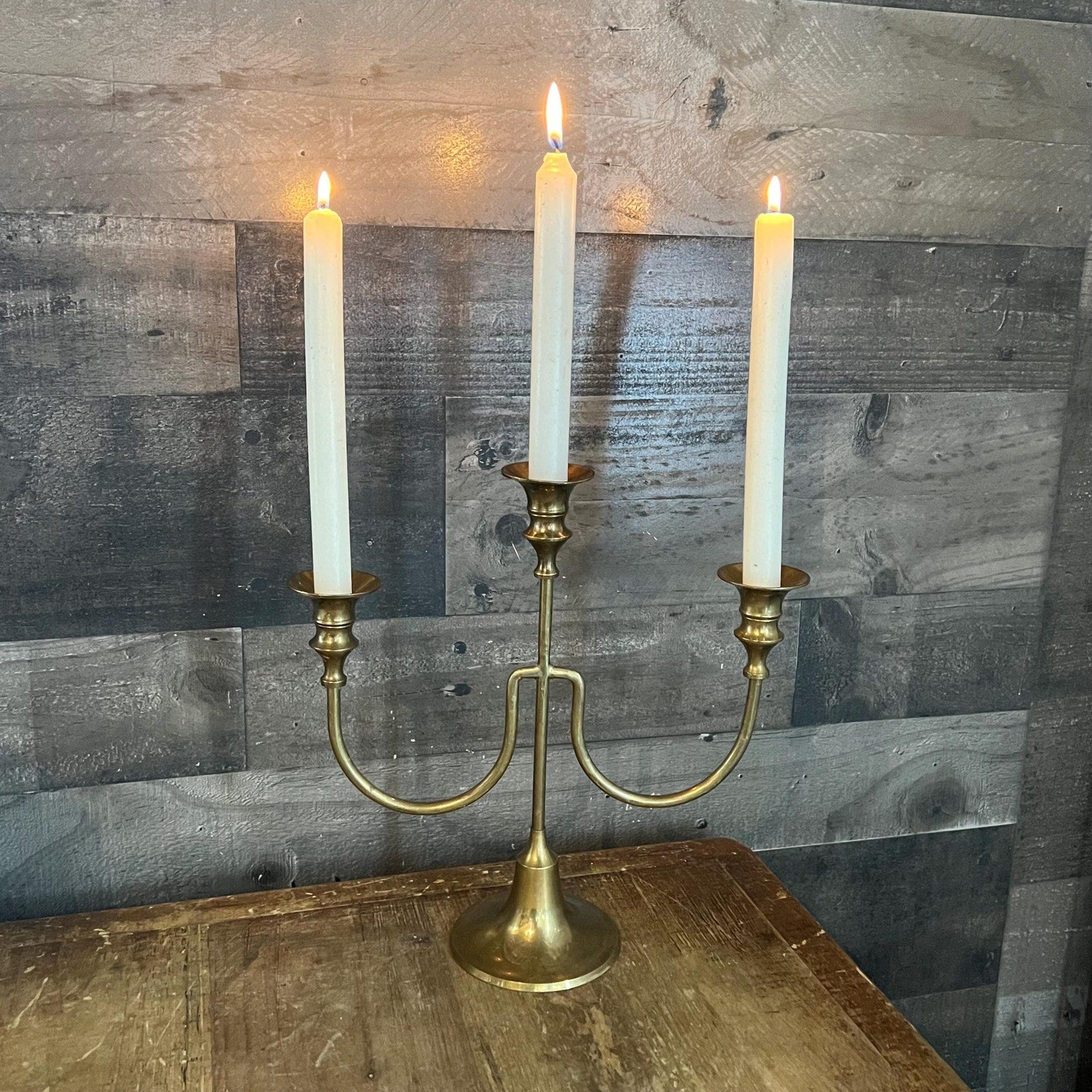 This Vintage 3 Candle Brass Candlestick Holder Candelabra will look immaculate in your space! It’s perfect for showcasing in your entryway, hallway, dining room, living room, office and more! Solid brass. Handcrafted in India.