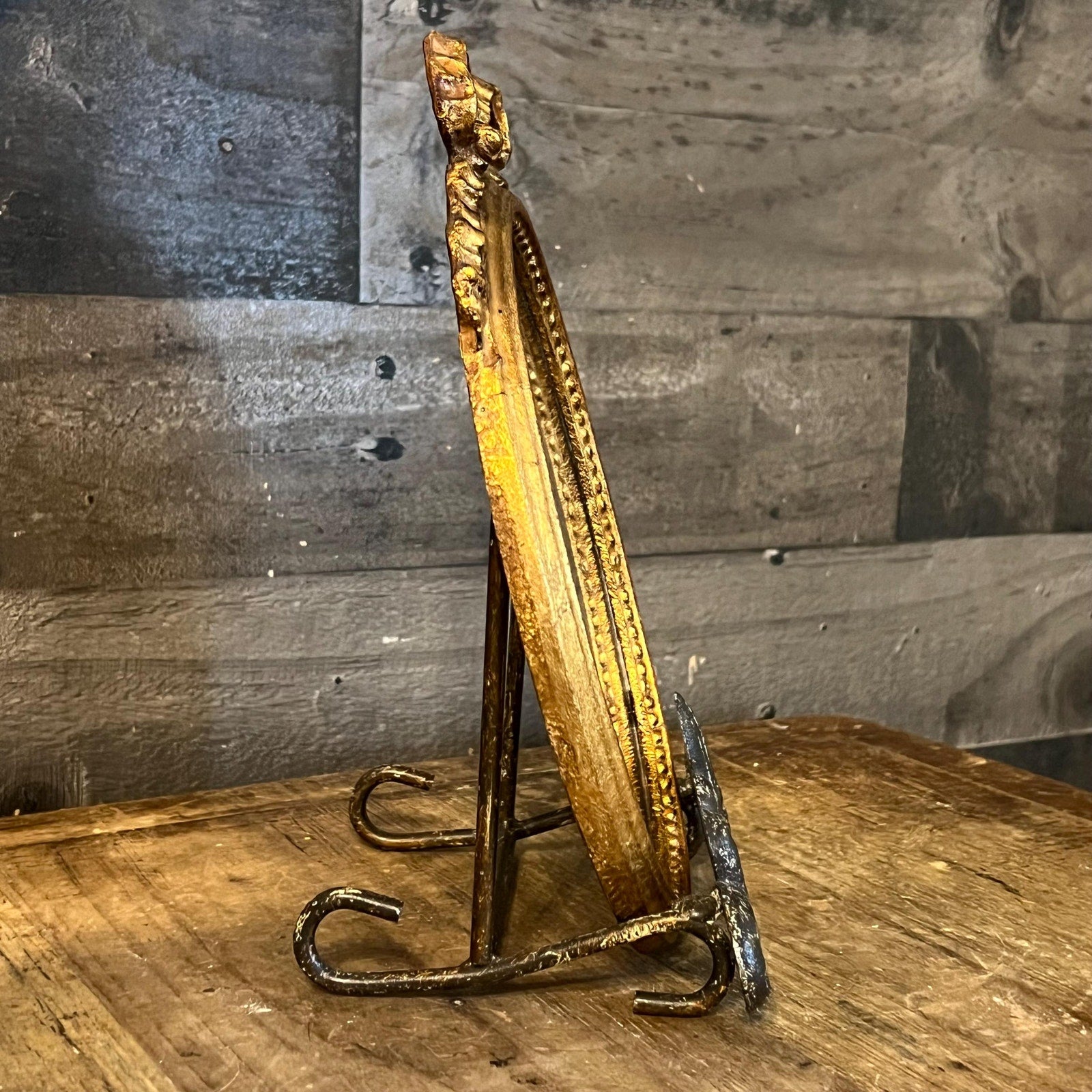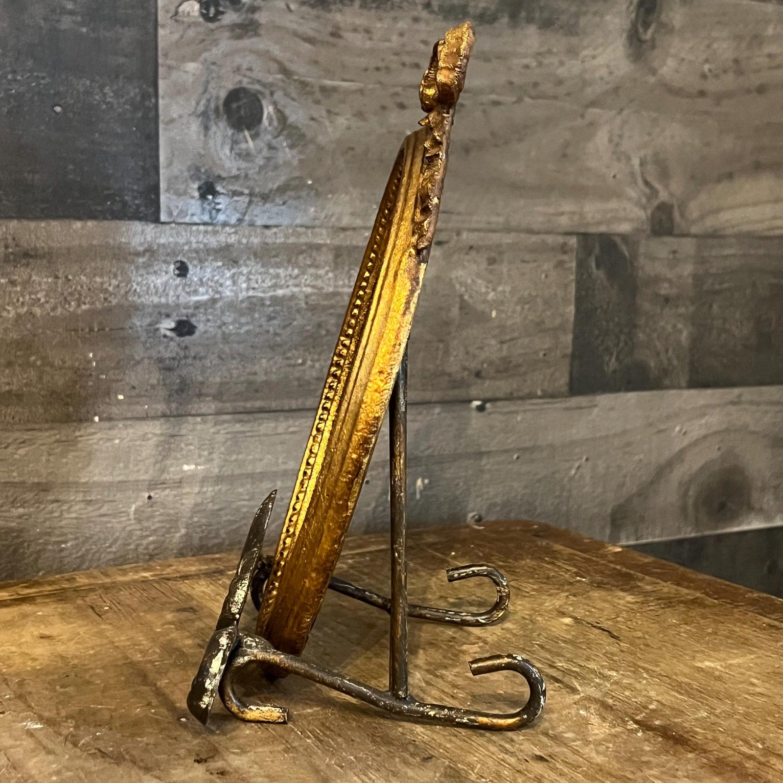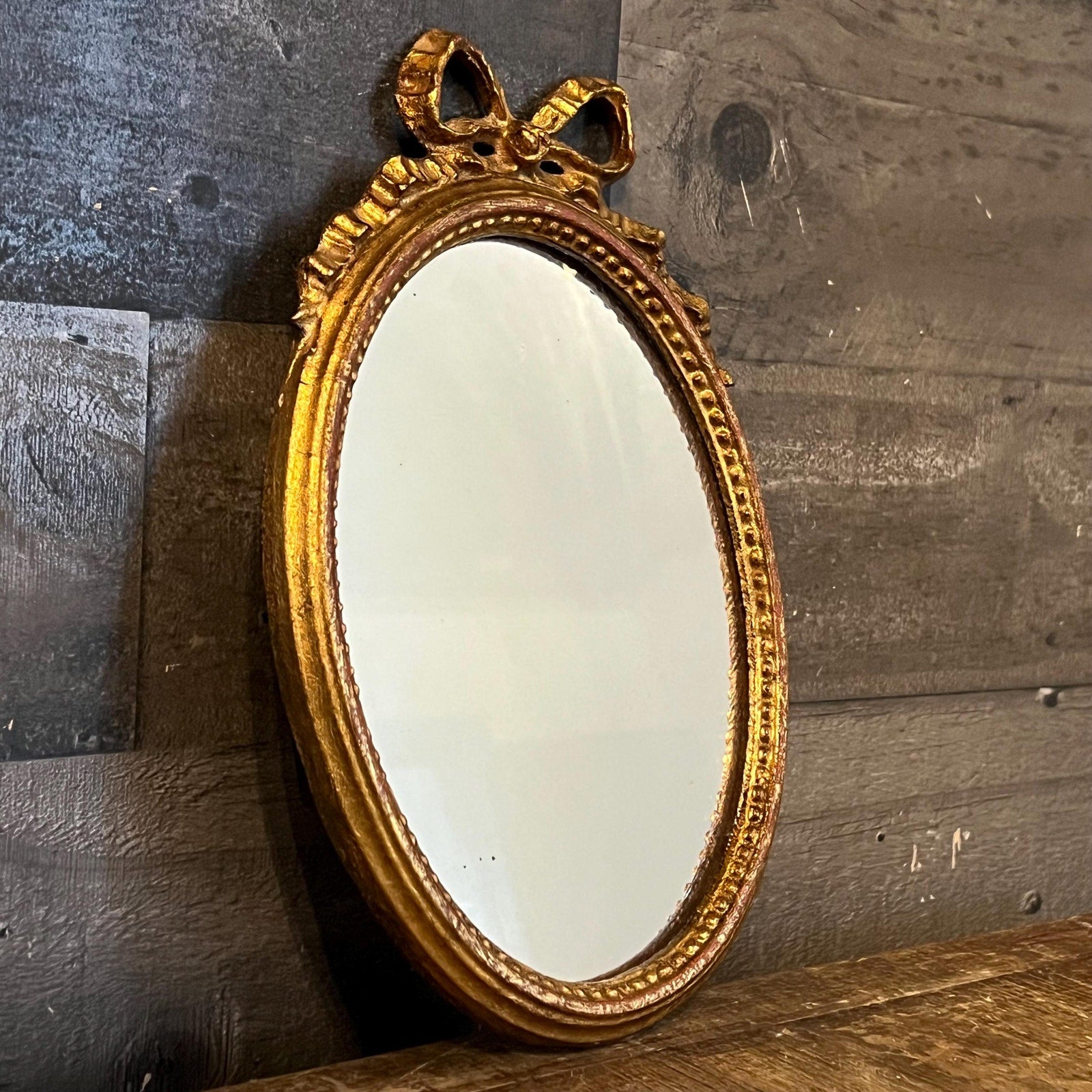This Vintage Bow Accent Oval Italian Gilded Mirror will look immaculate in your space! It’s perfect for styling in your hallway, bedroom, bathroom, entryway, nursery, living room, kitchen, dining room, office and more! It features a bow at the top, with a nailhead design around the edge of the mirror. Stamped Made in Italy on the back. Measures about 5 1/2 inch wide x 9 inch tall