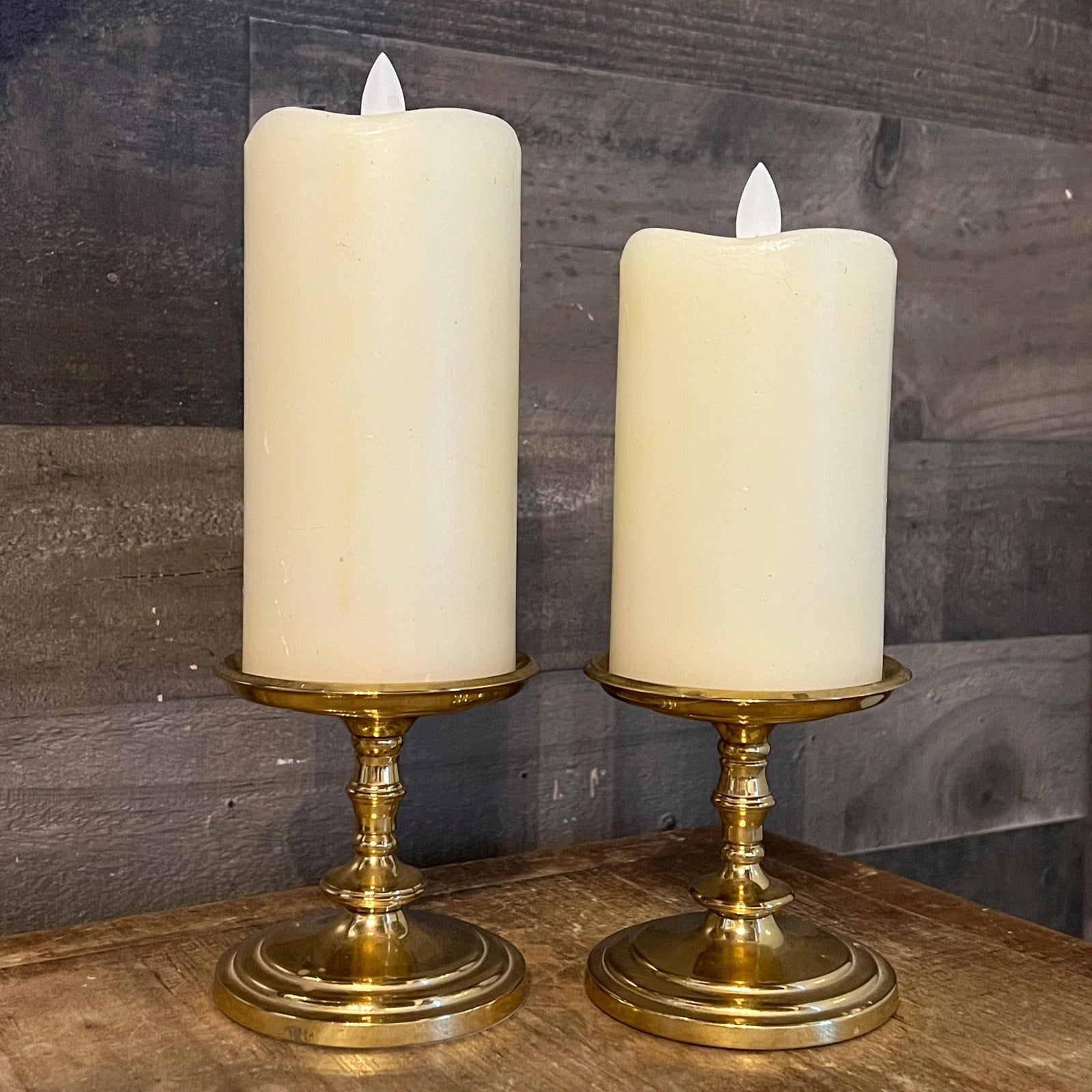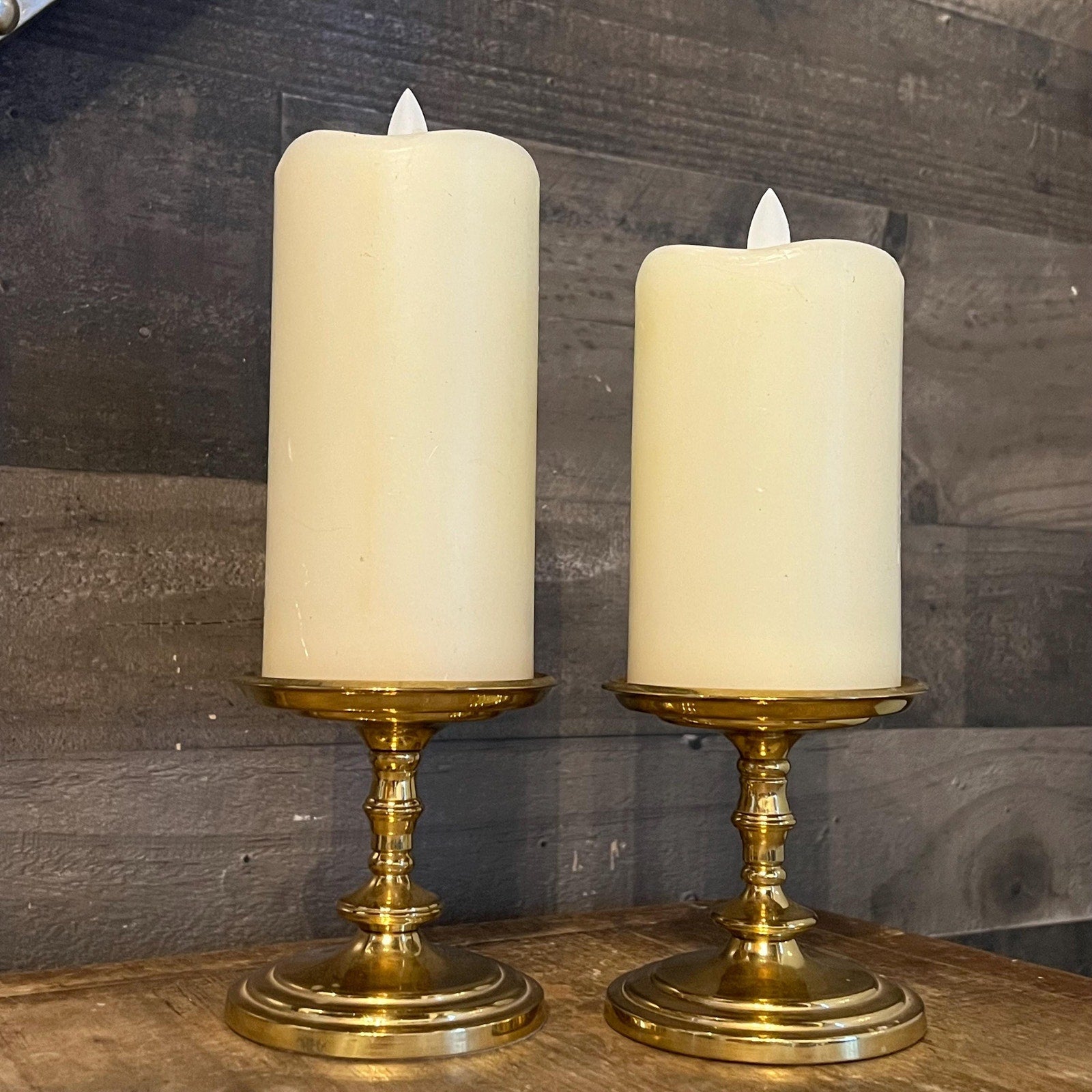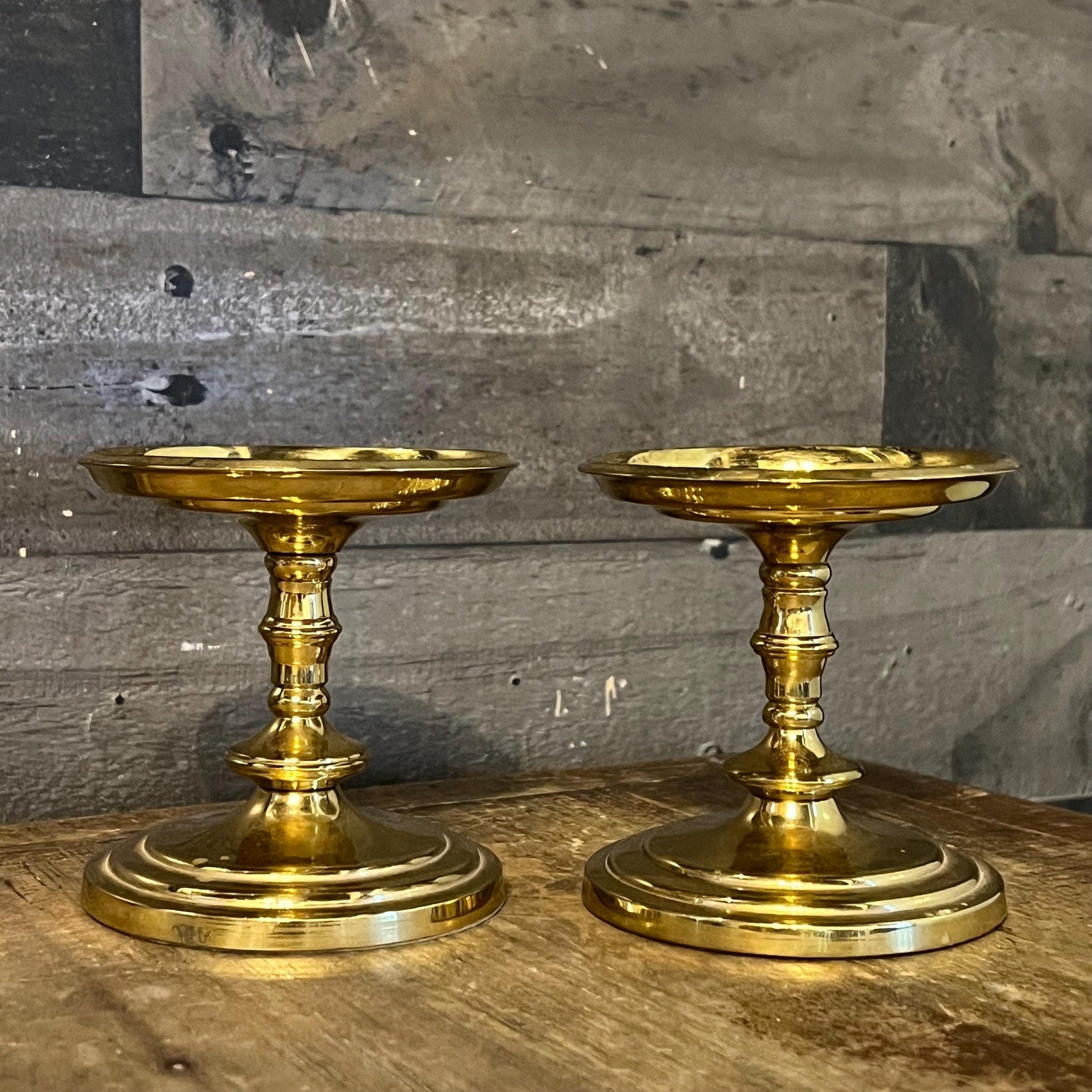 This pair of Vintage Brass Pedestal Pillar Candle Holders will look lovely in your space! Style these in your hallway, entryway, office, living room, dining room, kitchen, bedroom and more! Perfect for displaying on your vanity, tabletop, dresser, counter, desk - the list goes on! Each measures about 3 3/4 inch tall x 3 1/2 inch wjde