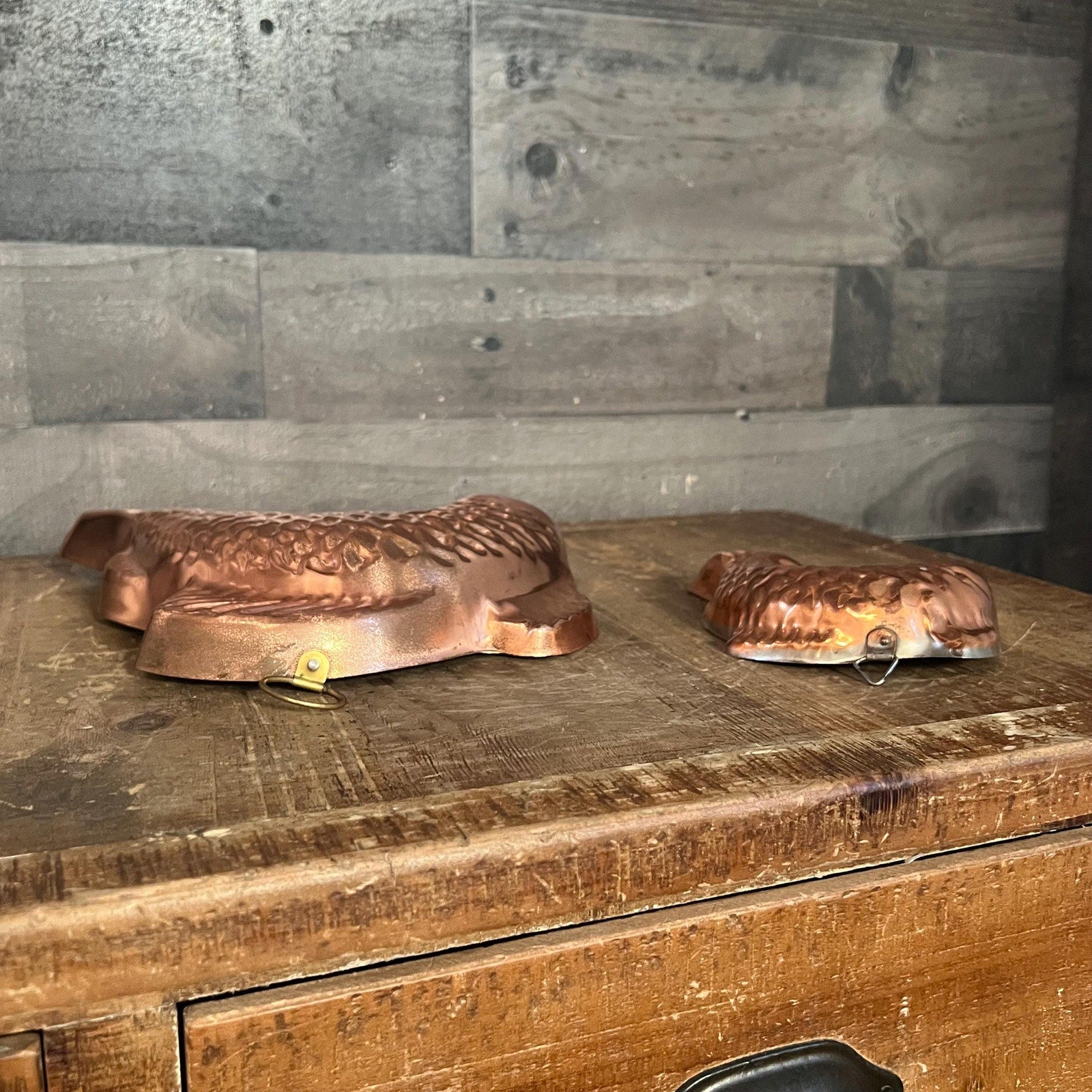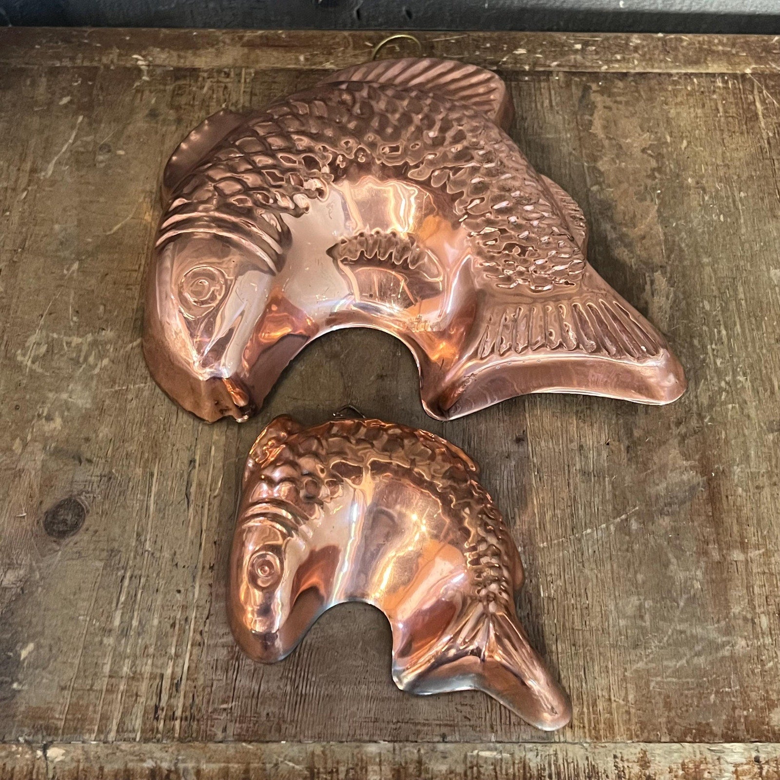 These Vintage Copper Big Fish Little Fish Wall Hanging Molds will look lovely in your space! Perfect for showcasing in your kitchen, pantry, dining room and more! Big fish measures about 10 inch wide x 9 1/4 inch tall x 1 3/4 inch deep - little fish measures about 6 inch wide x 4 1/2 inch tall x 1 1/4 inch deep