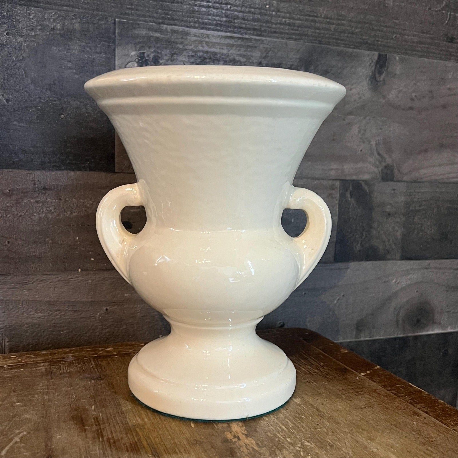 This Vintage Creamy White Handled Trophy Urn Pottery Vase will look lovely in your space! Perfect for showcasing your favorite flowers of choice to display in your entryway, office, hallway, bedroom, kitchen, living room, dining room and more! Measures about 8 3/4 inch tall x 7 inch wide