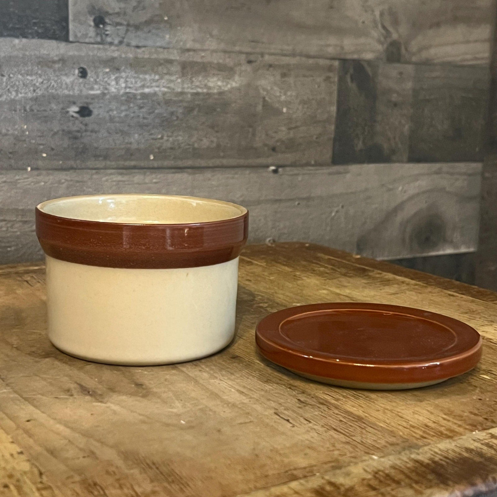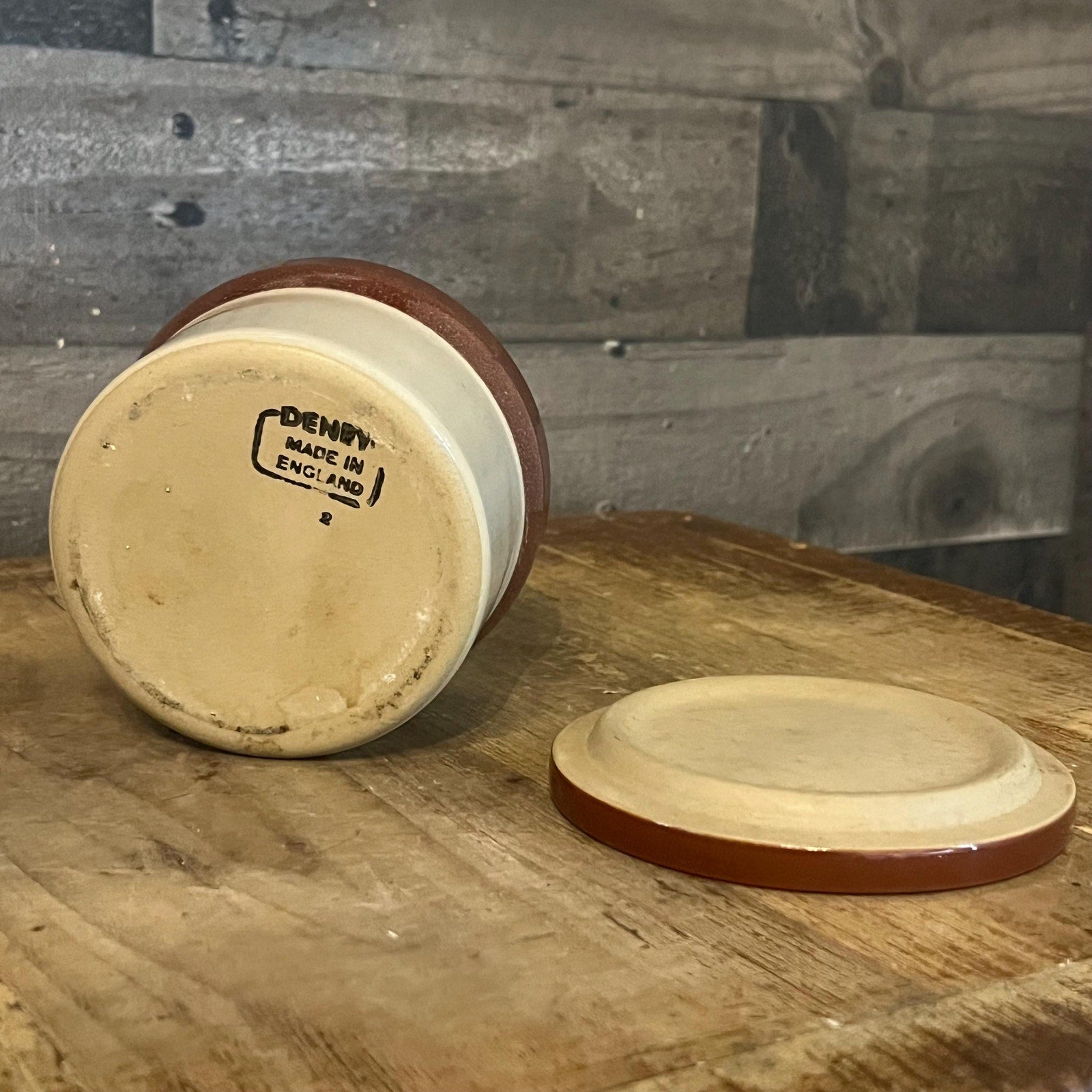 This Vintage Denby England Small Lidded Brown and Tan Stoneware Canister will look wonderful in your space! Makes a great salt pinch, jam pot, jewelry dish, key dish, soap dish - the list goes on! Measures about 3 inch tall x 4 inch wide