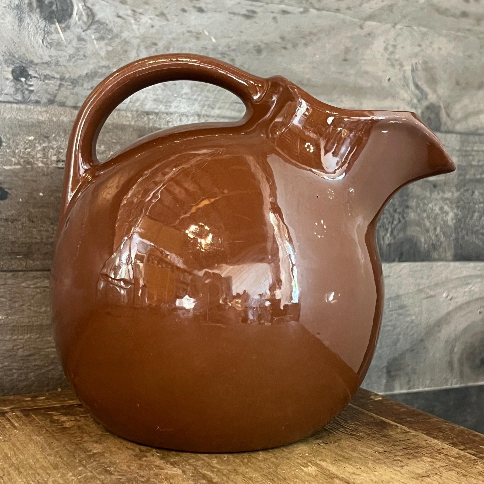 This Vintage Hall Pottery Brown Handled Round Bubbly Pitcher will look lovely in your space! Wonderful for serving up your favorite drink of choice, as well as use as a water pitcher for your plants and flowers and use as a vase! Measures about 7 inch tall x 7 inch deep x 6 inch wide