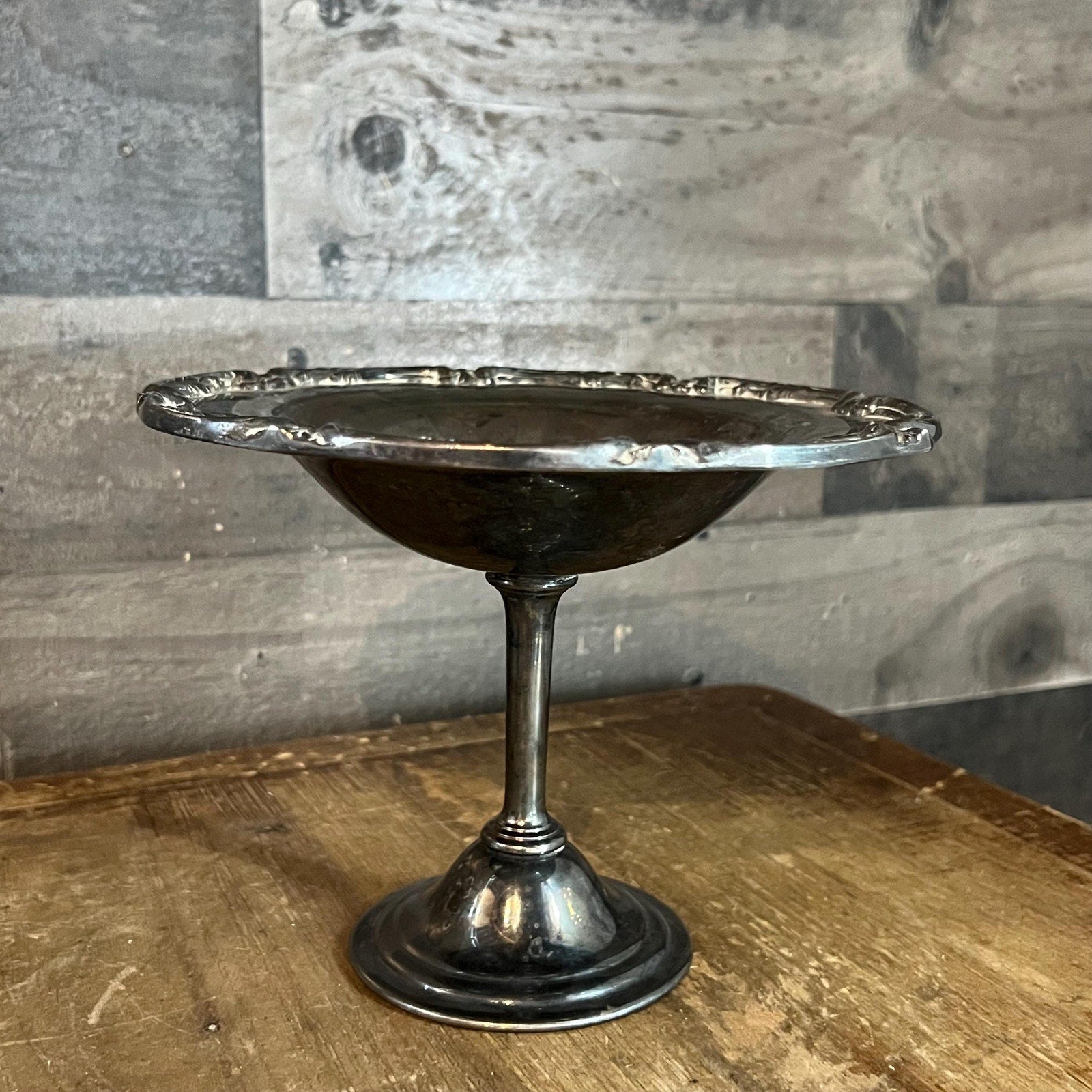 This Vintage International Silverplated Long Stem Pedestal Compote Shallow Bowl will look lovely in your space! It’s perfect for use as serveware as well as decor! Serve shrimp cocktail, crackers, cheese, charcuterie and more! Also wonderful for use as a fruit bowl, jewelry dish, key dish - the list goes on! Style it in your hallway, entryway, kitchen, living room, bathroom, office or dining room. Features a lovely design along the rim. Measures about 7 inch wide x 5 1/2 inch tall. You will absolutely love the character it’s aged look brings!