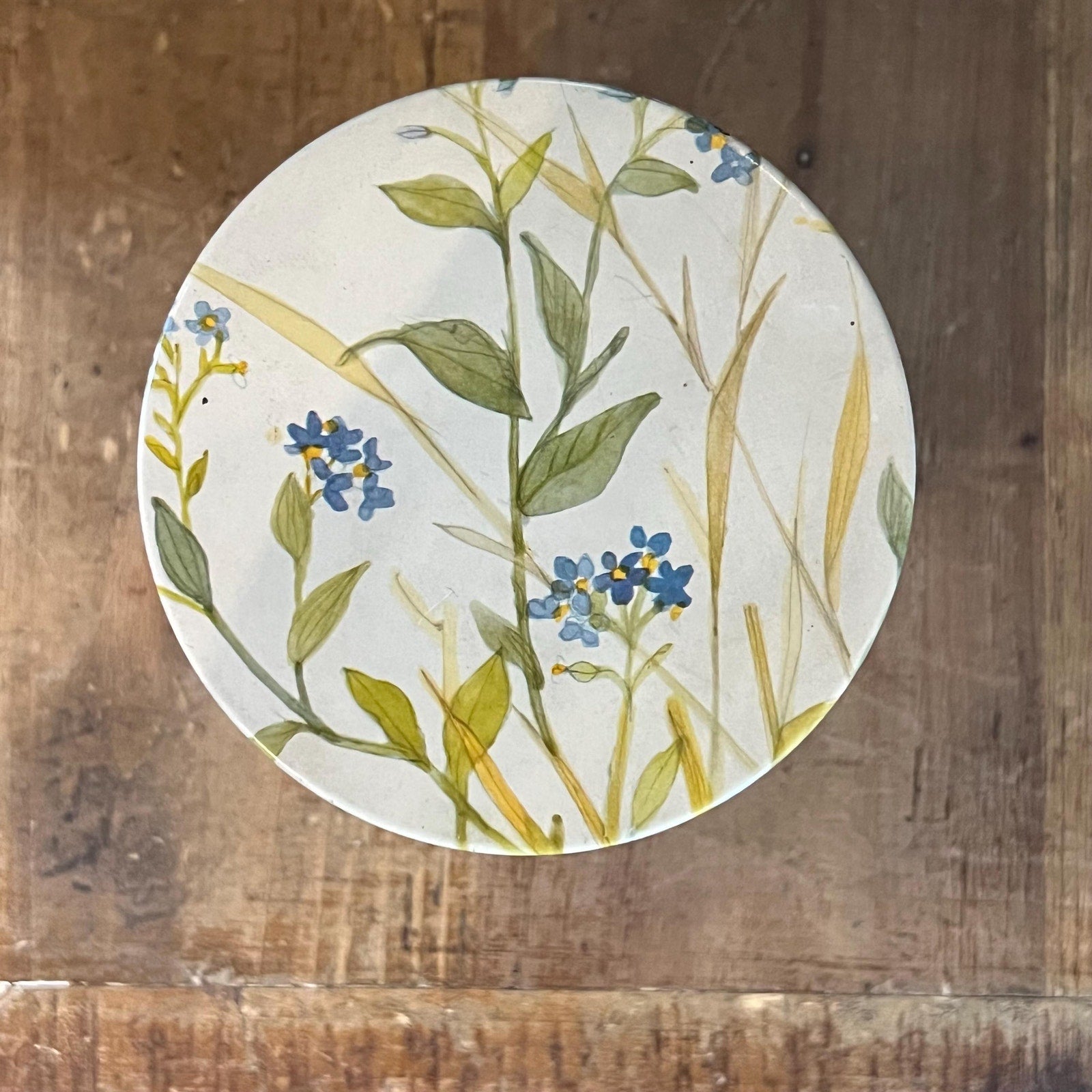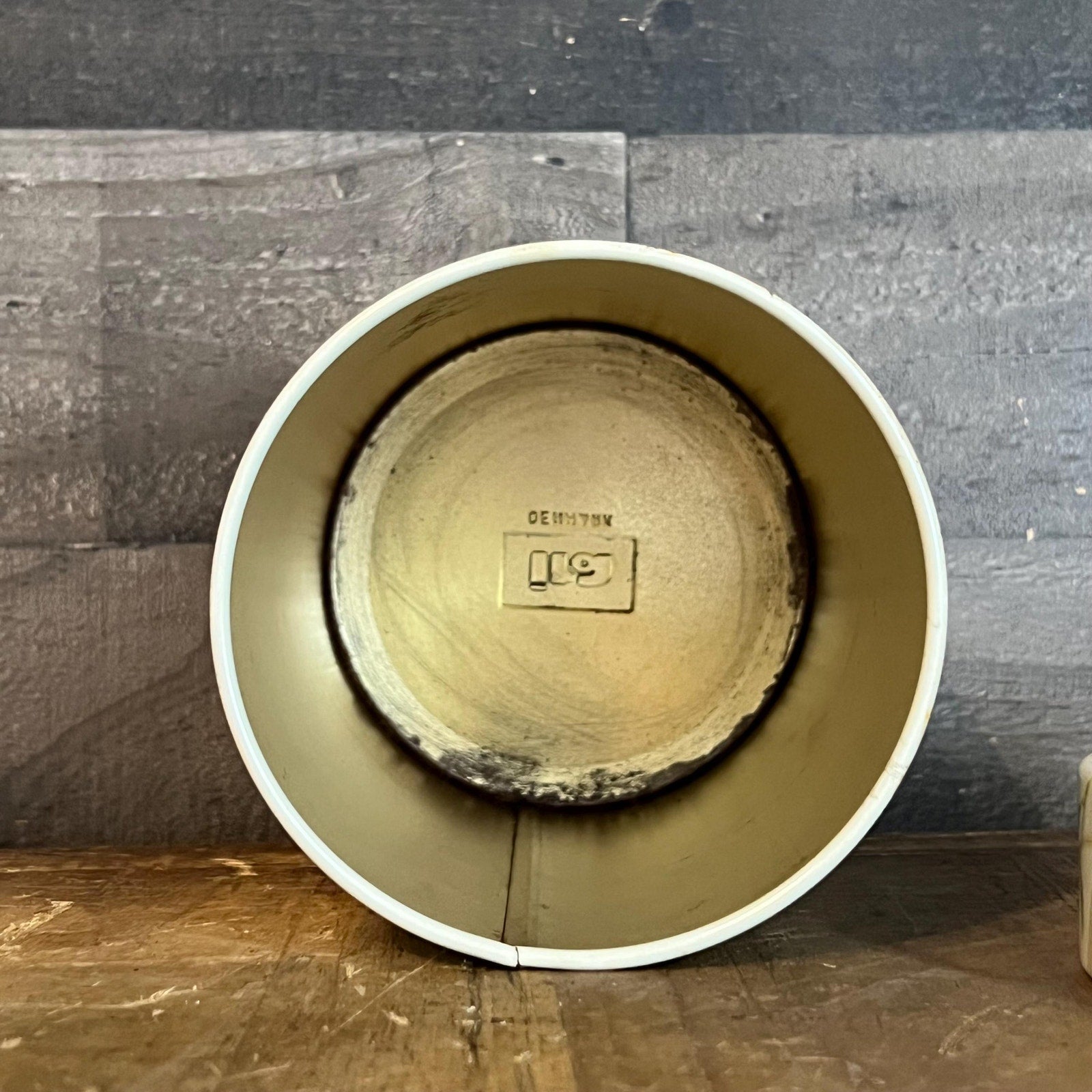 This Vintage IRA Denmark Floral Cylinder Lidded Tin Jar will look lovely in your space! Featured green stemmed blue flowers! Measures about 4 1/2 inch wide x 6 1/2 inch tall