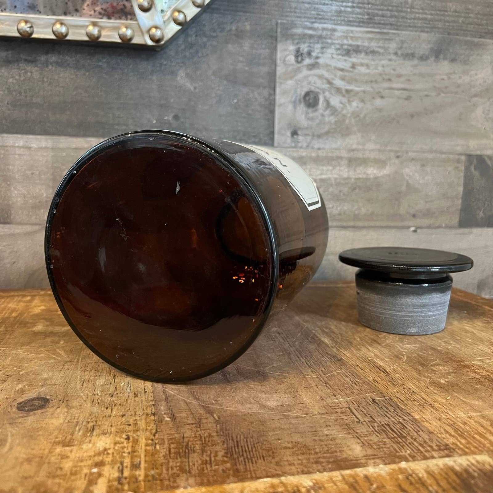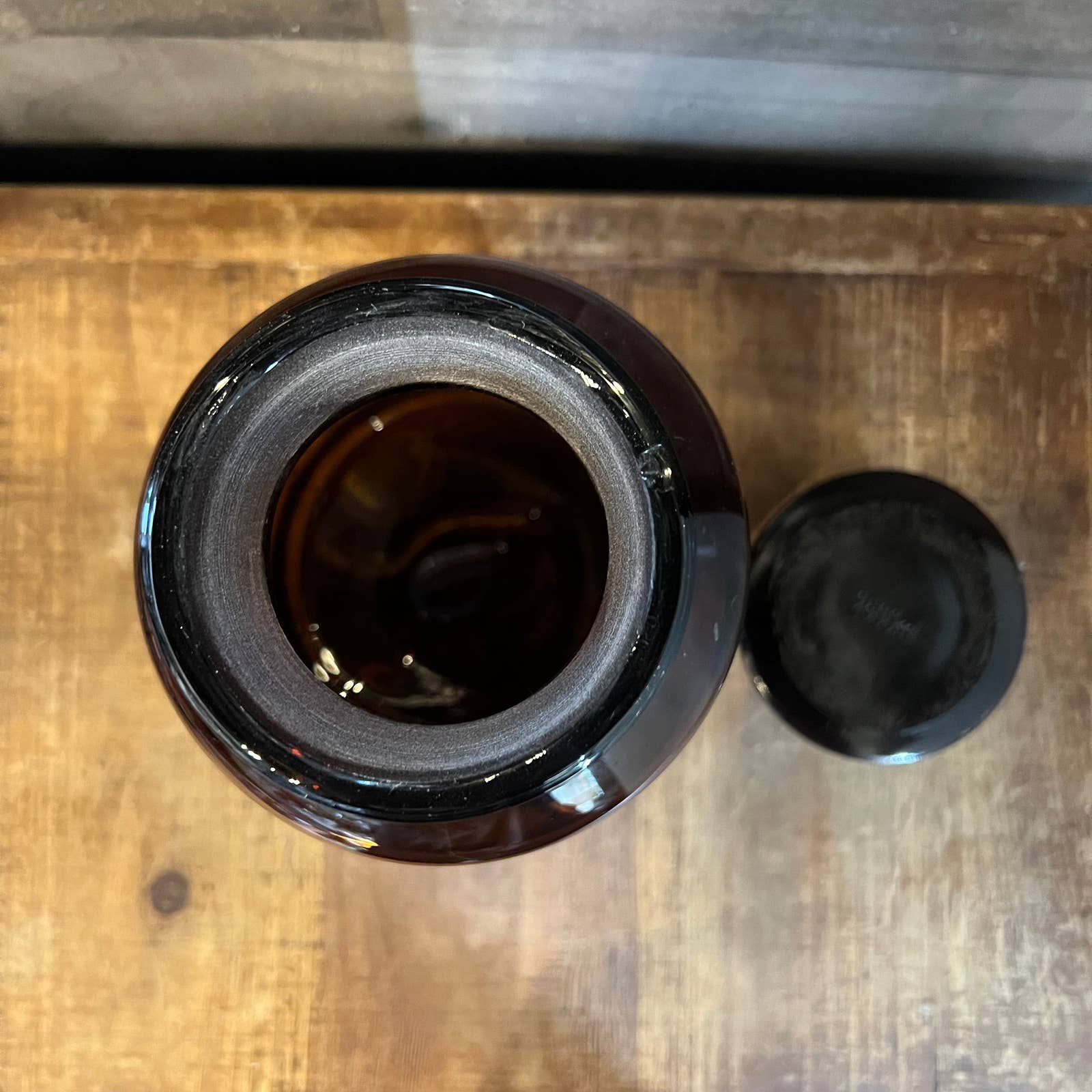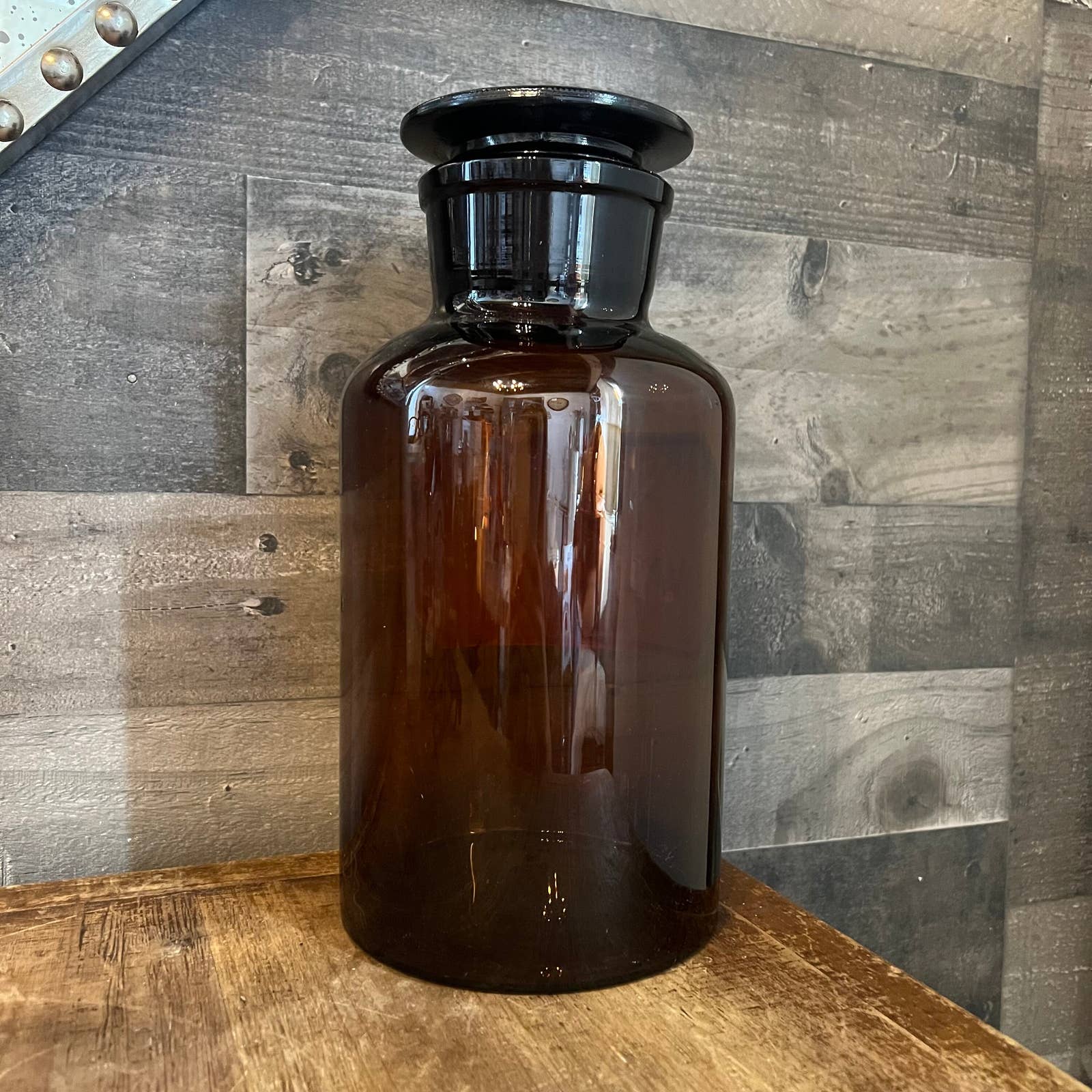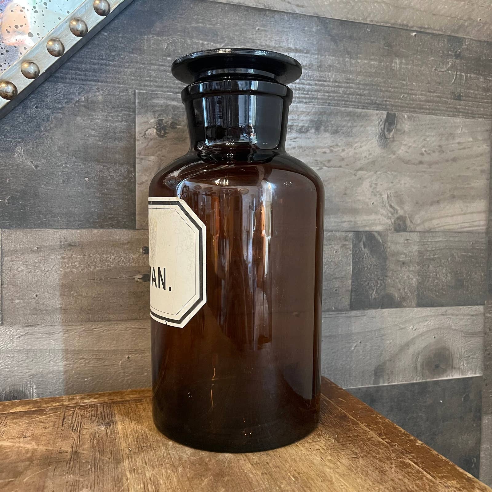 This large vintage brown glass apothecary bottle with stopper / Tincture of Valerian pharmacy bottle / chemist jar will look lovely in your space! Lid is marked 2500ml. We absolutely love the character its aged look brings. Perfect for styling in your office, pantry, kitchen, dining room and more! Also makes for a nice vintage piece of Halloween decor. If you’re not a fan of the label you should be able to soak it off! Great piece of decor, use as a vase, use to store rice - the list goes on! This measures about 11 1/2 inch tall x 4 inch wide lid x 5 1/2 inch wide base