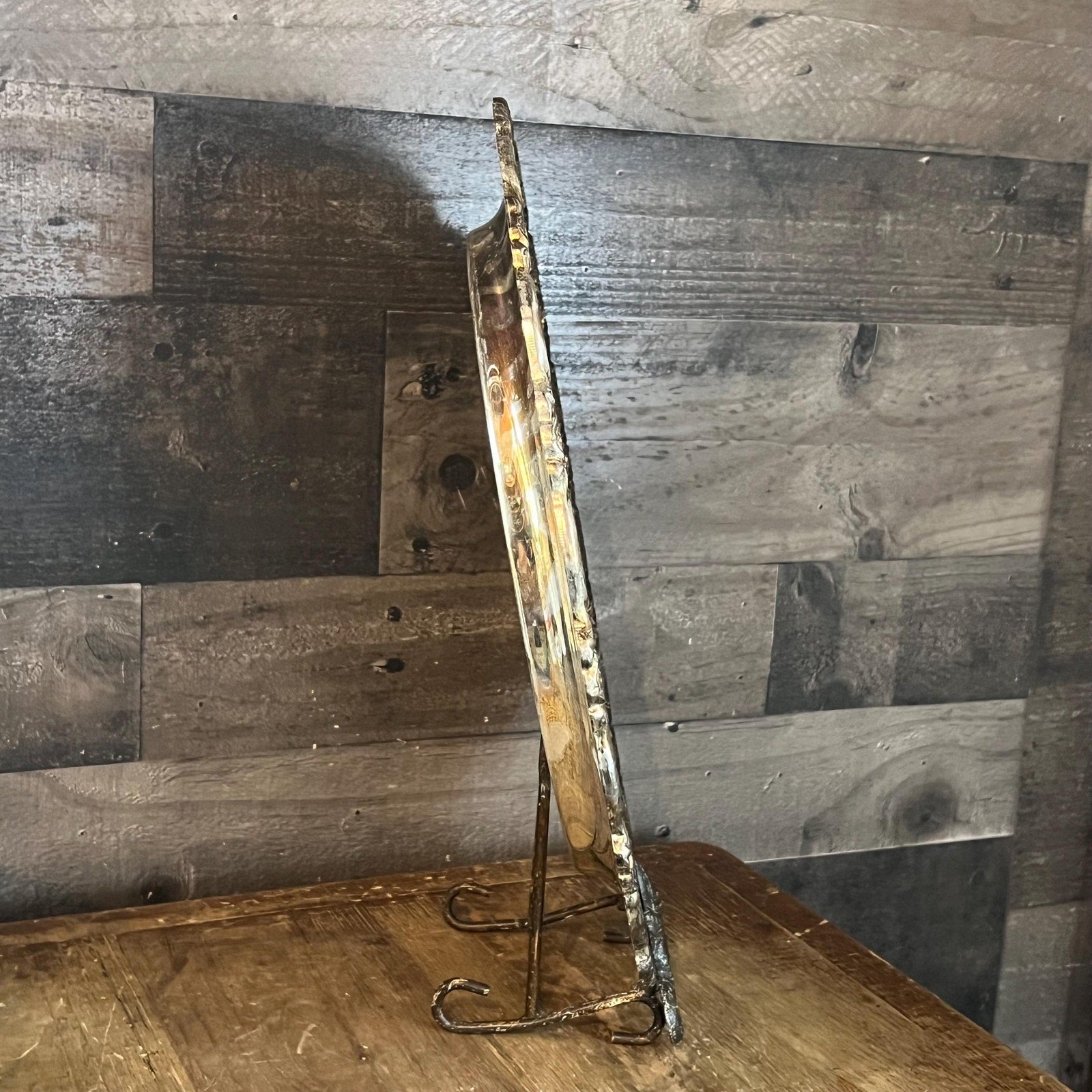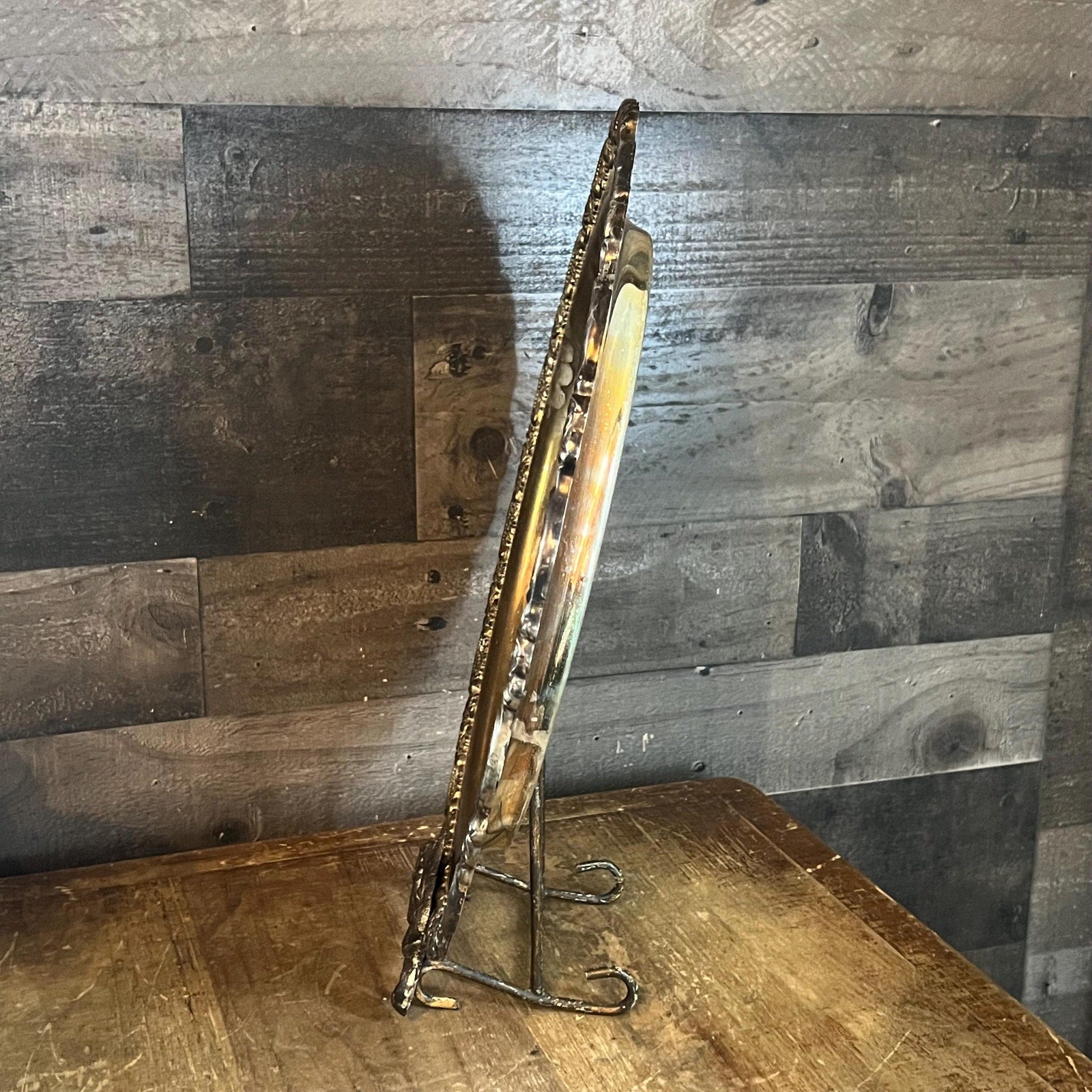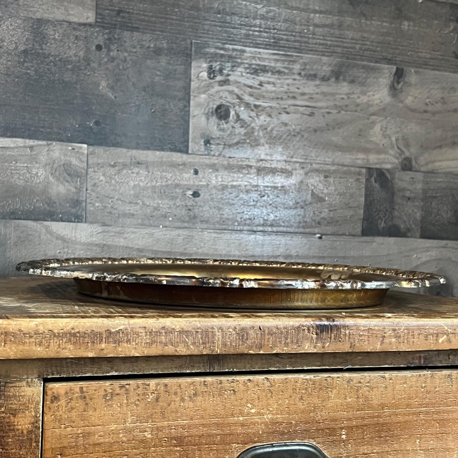 This Vintage Oneida Silverplated Round Serving Tray with Rose Embossed Edge Design will look amazing in your space! It’s great for decor, serveware and bar purposes! Use this in your hallway, entryway, kitchen, bar cart, bedroom, closet, office - the list goes on! Style candles, decanters, perfume and more! Has a beautiful gold tone to it on the top - you will absolutely love the character it’s aged look brings. Measures about 15 inch wide x 1 inch tall