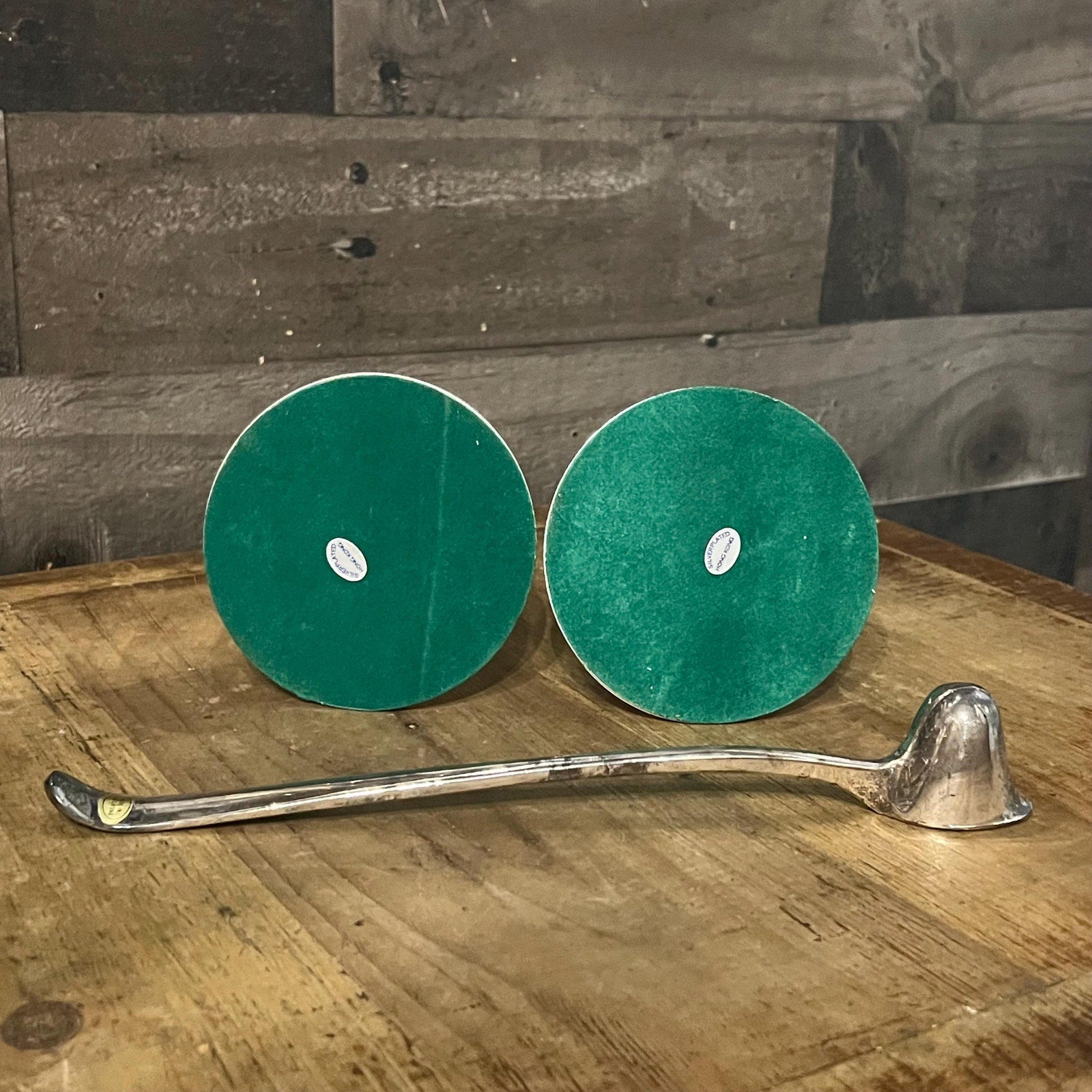 This Vintage Pair of Silverplated Candlestick Holders and Long Handled Candle Snuffer will look lovely in your space! Wonderful for styling in your hallway, entryway, living room, kitchen, dining room, office, bedroom, bathroom and more! Each candlestick holder measures about 3 3/4 inch tall x 3 7/8 inch wide base x candle snuffer measures about 8 inches long