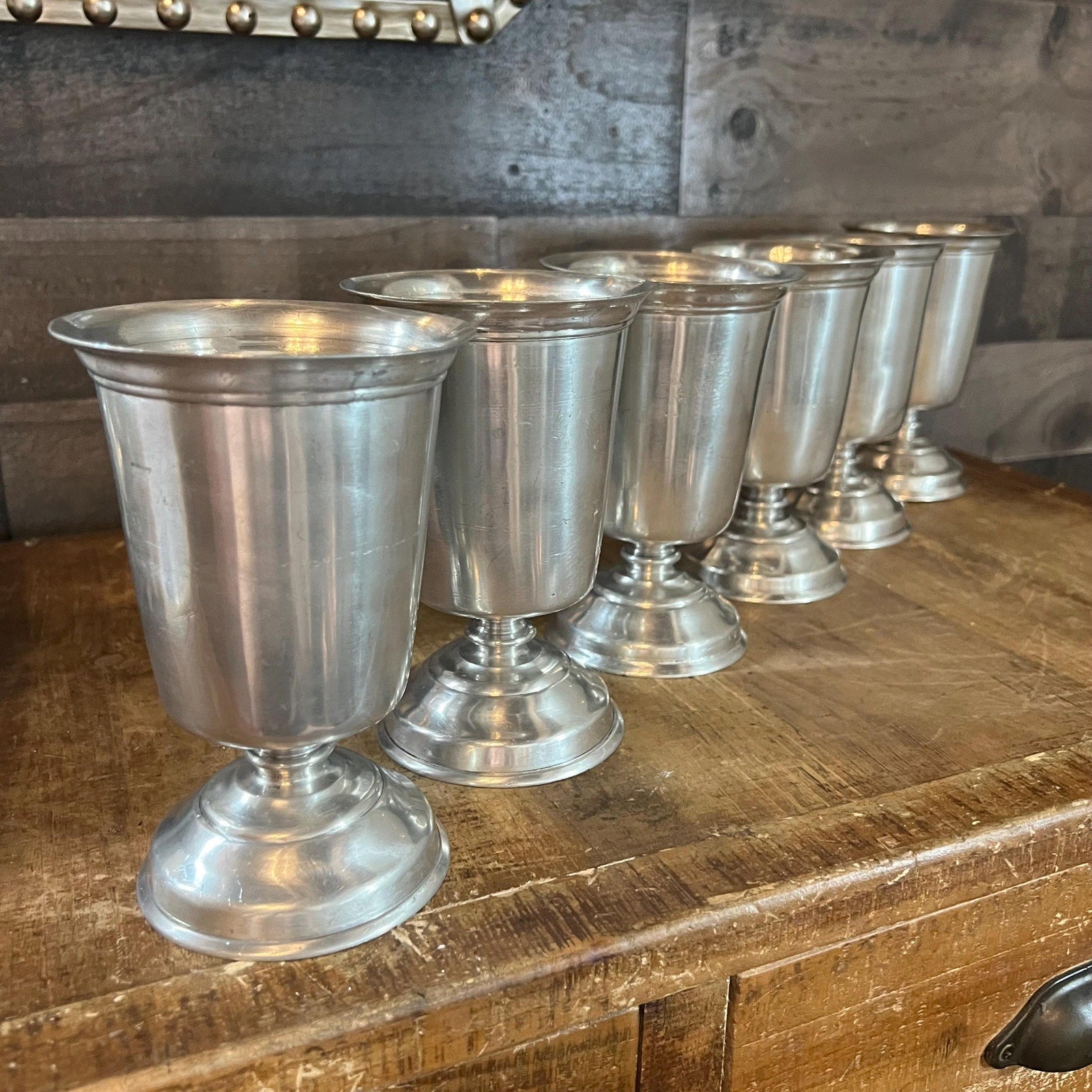 These Vintage Pewter Short Stem Goblets - Set of 6 will look wonderful on your tabletop! They’re perfect for serving up your favorite drink of choice as well as ice cream! All angles are pictured. Each goblet measures about 6 inch tall x 4 inch wide