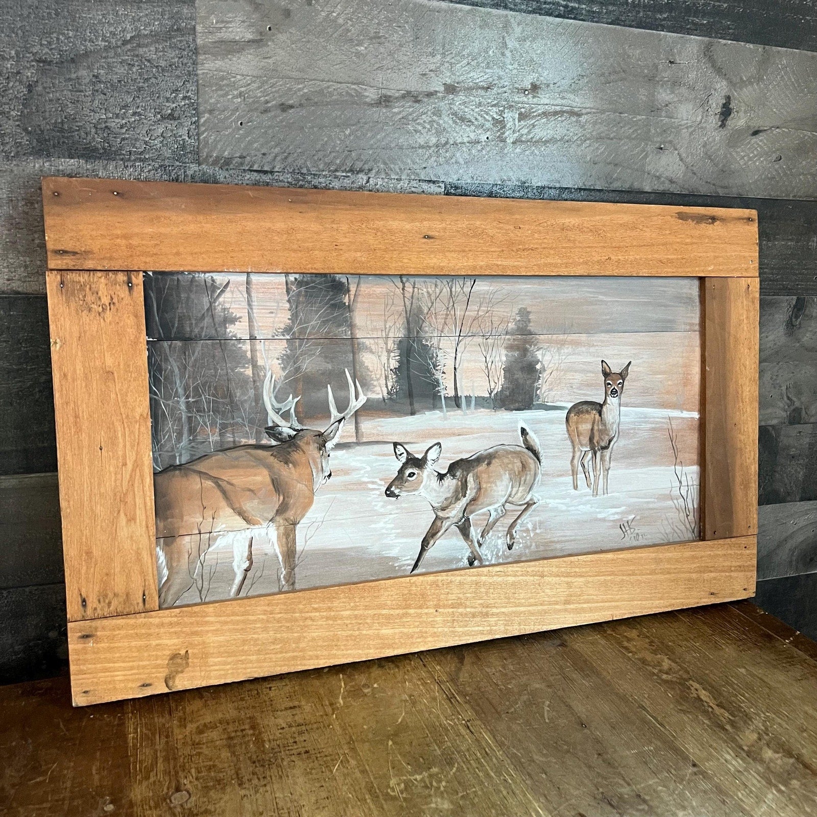 This Vintage Rectangular Rustic Painted Wood Winter Forest Deer Scene will look lovely in your space! Features a snowy scene with bare trees and a buck and 2 doe. Artist signed. Heavy! Measures about 24 3/4 inch wide x 15 1/2 inch tall x 1 1/4 inch deep
