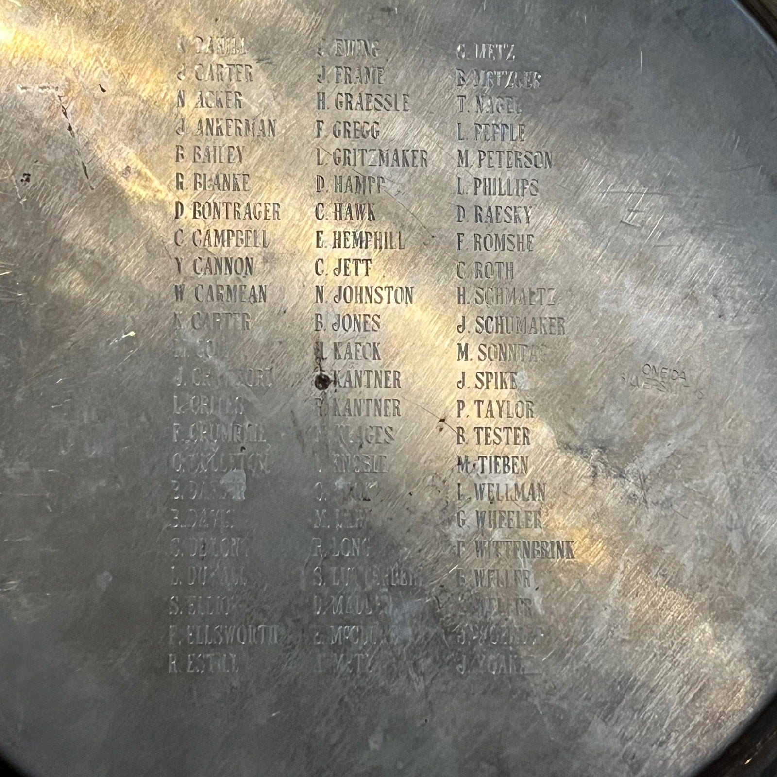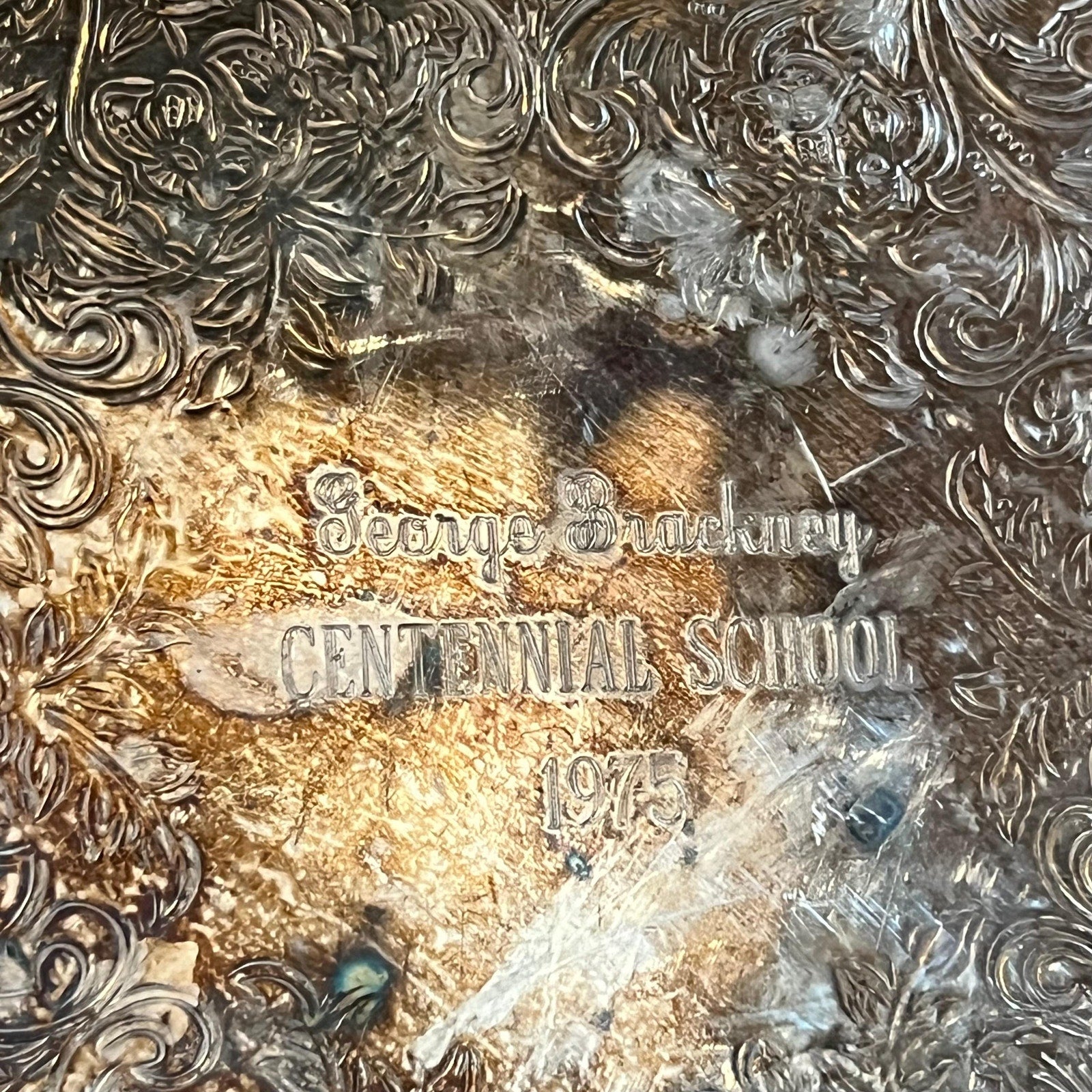 This Vintage Round Silverplated Oneida Silversmiths Trophy Tray will look immaculate in your space! Reads “George Brackney CENTENNIAL SCHOOL 1975” on the front, with a list of names on the back - the back reads the first initial of their first name and full last names. Perfect for displaying in your hallway, entryway, kitchen, living room, office and more! You will absolutely love the character it’s aged look brings! Measures about 12 1/4 inch wide x 3/4 inch tall