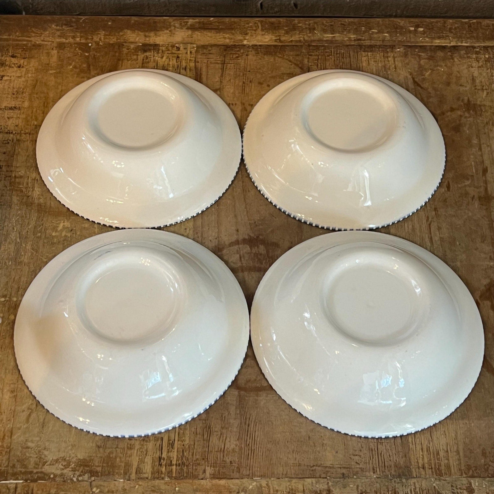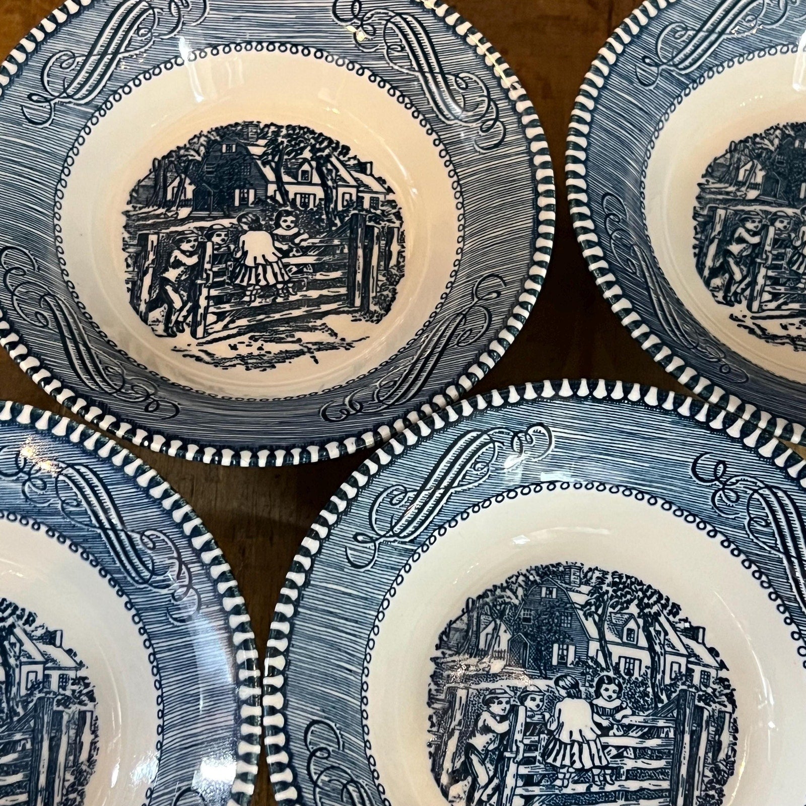 This set of 4 Vintage Royal USA Currier and Ives Blue Bowls - Fruit Bowls - Dessert Bowls - Cereal Bowls will look lovely in your space! Each bowl is a creamy white base color and showcases a country scene in the center and rim around the edge in blue! Each bowl measures about 5 1/2 inch wide x 1 1/4 inch tall