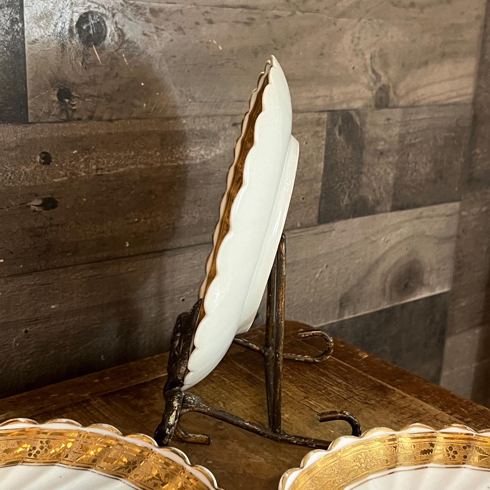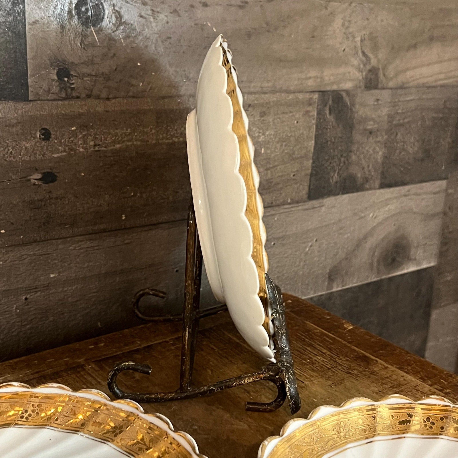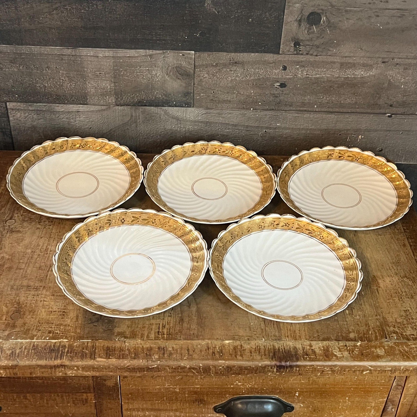 Vintage Scallop Rim White Swirl Coupe Plates with Gold Rim Design - Set of 5