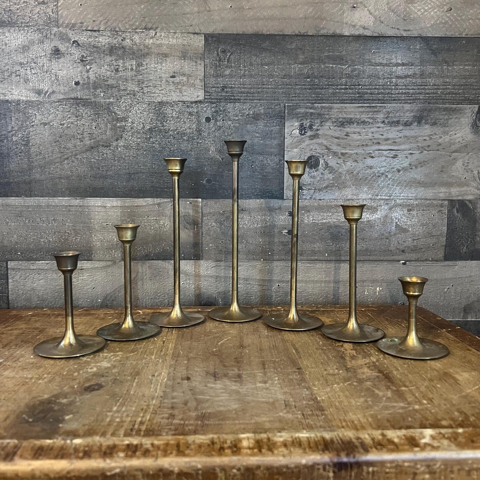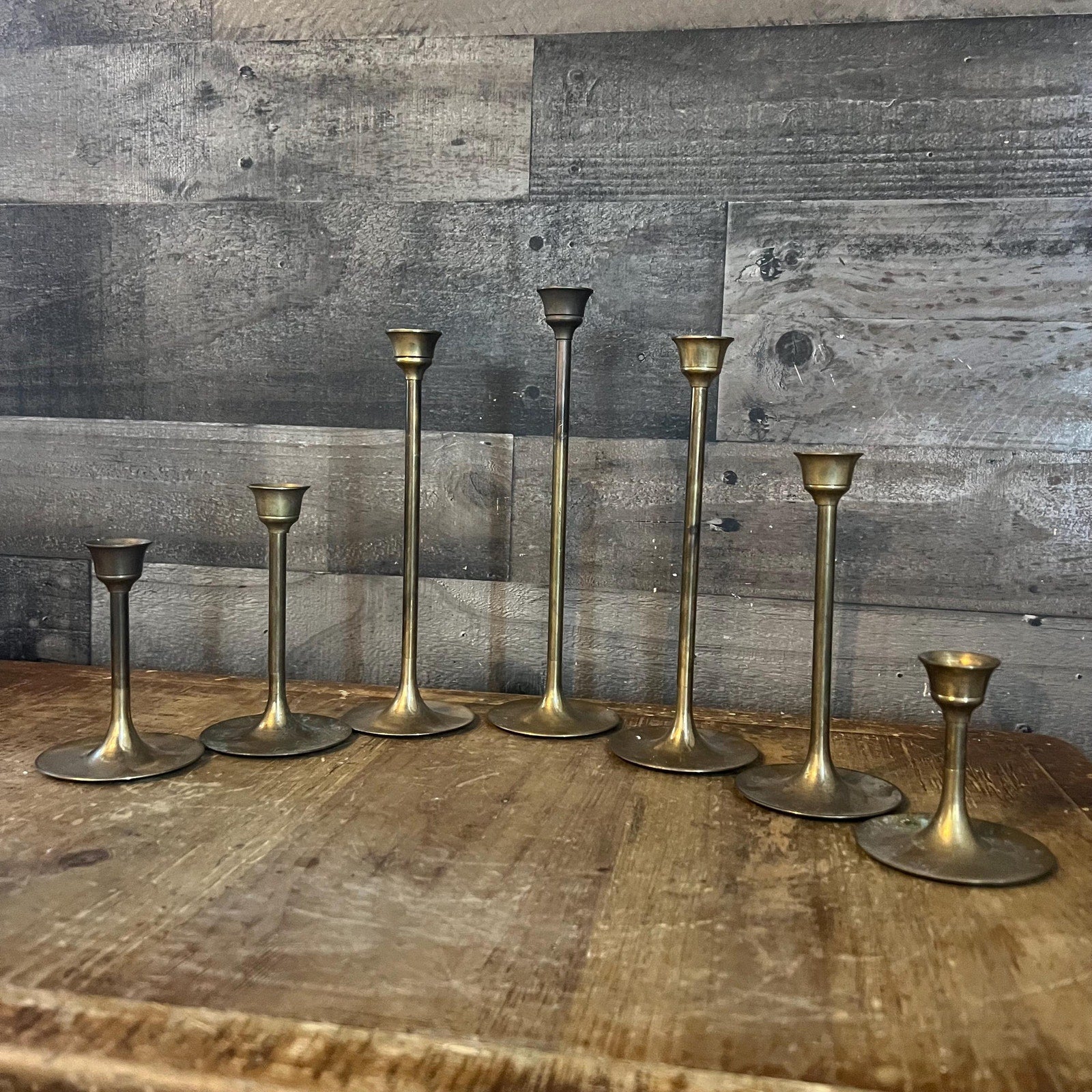 This Vintage Set of 7 Brass Graduating Tiered Candlestick Holders will look amazing in your space! Perfect for styling in your hallway, entryway, bedroom, living room, dining room, kitchen and more! The tallest measures about 9 inch tall x shortest measures about 3 inch tall x 2 3/4 inch wide base