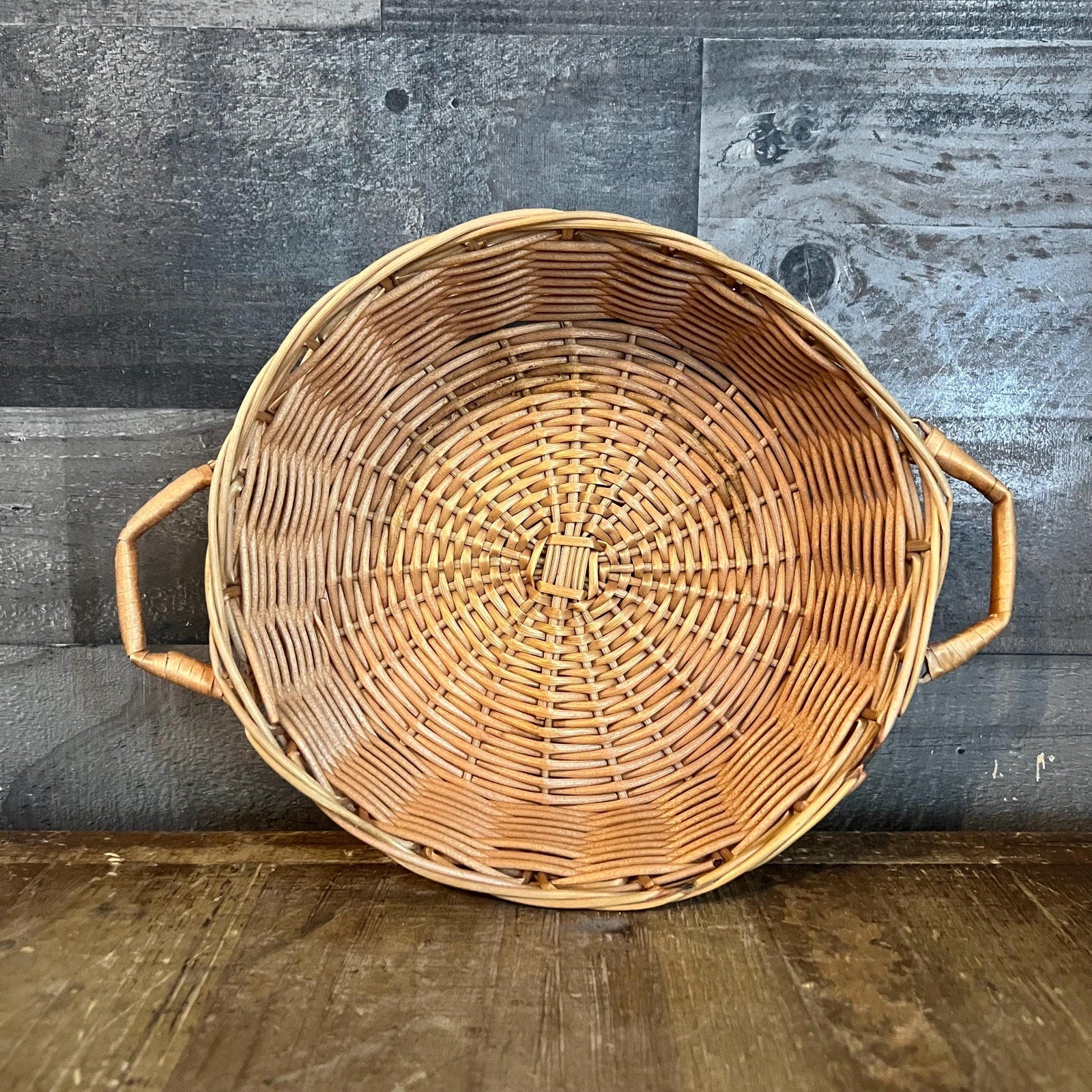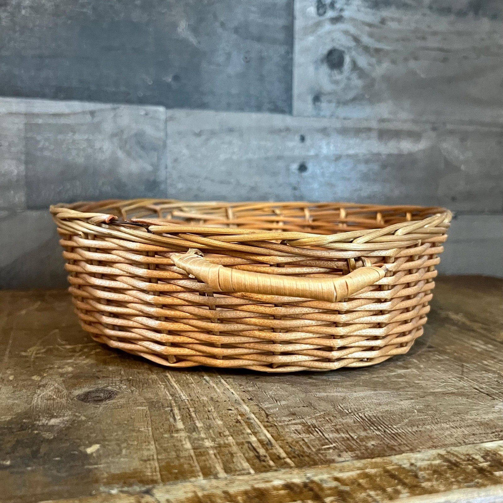 Vintage Shallow Handled Round Wicker Basket
