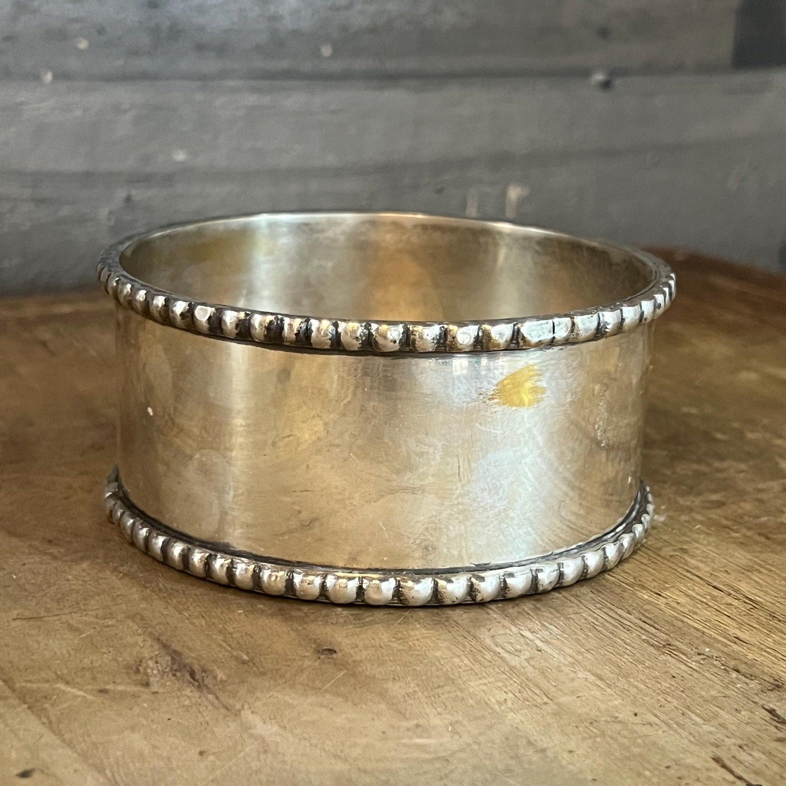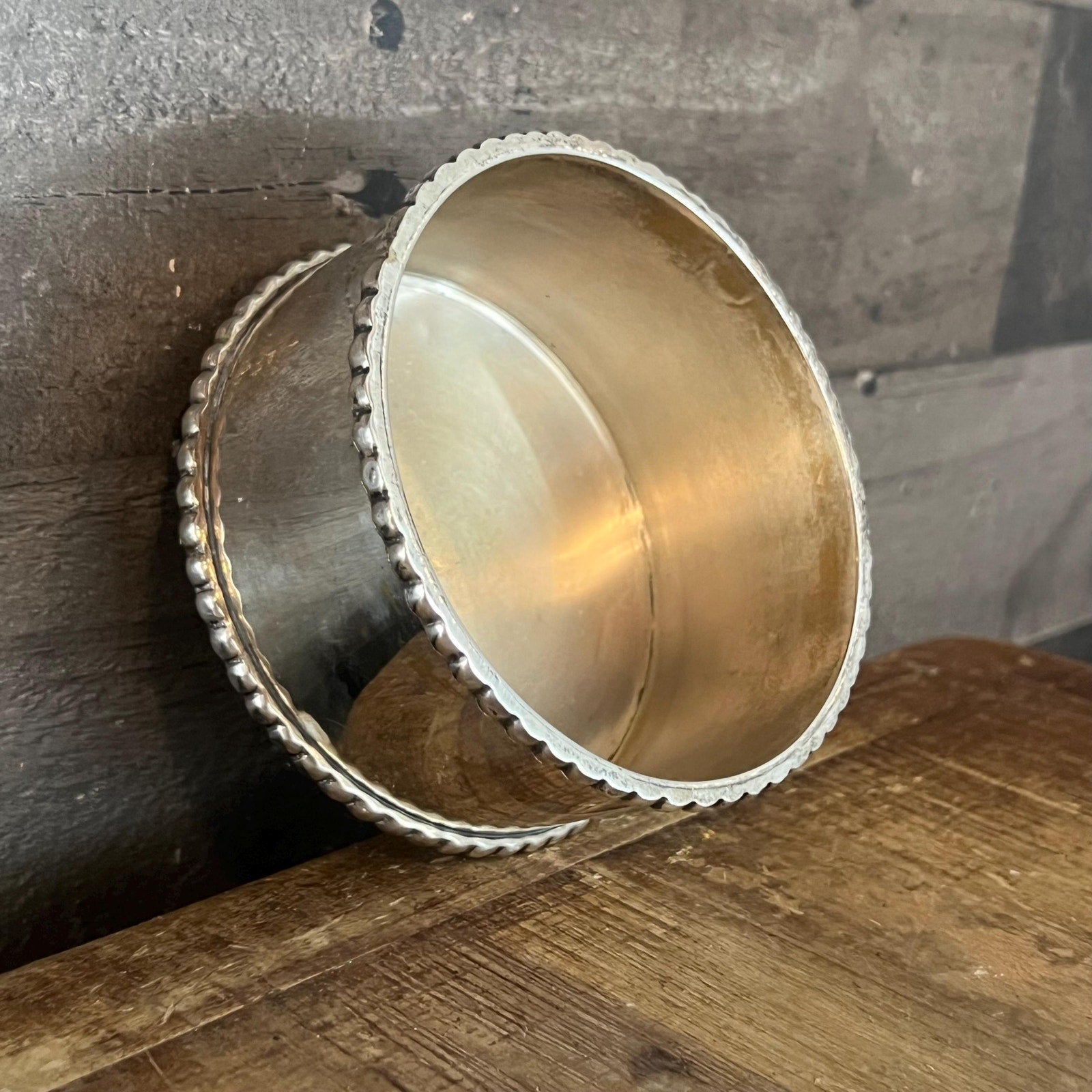 This Vintage Silverplated Bottle Coaster - Candle Vessel will look lovely in your space! Wonderful for use as a bottle coaster for your favorite wine, candle holder and bowl for your keys, jewelry, hair ties and more! Measures about 4 1/4 inch wide x 2 inch tall