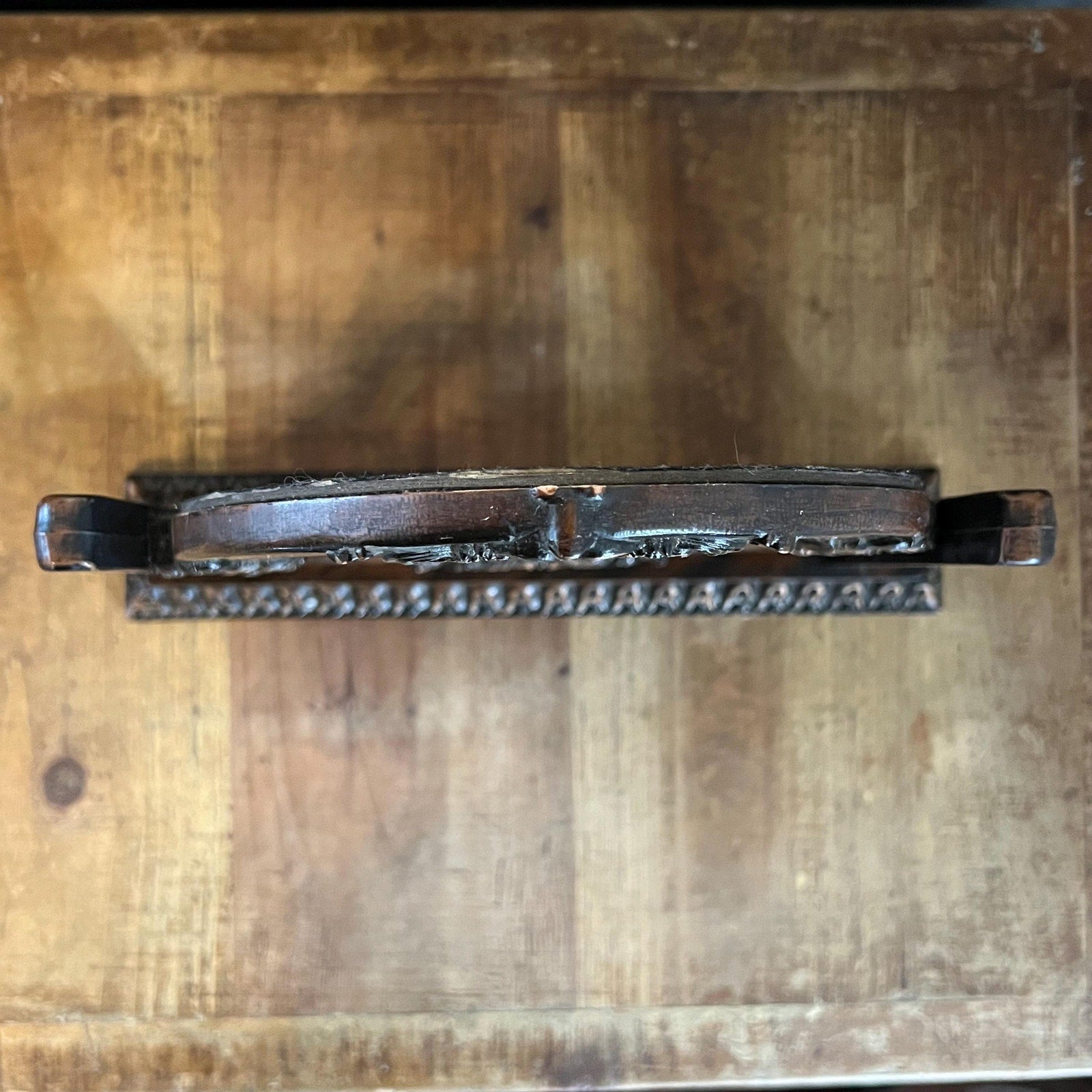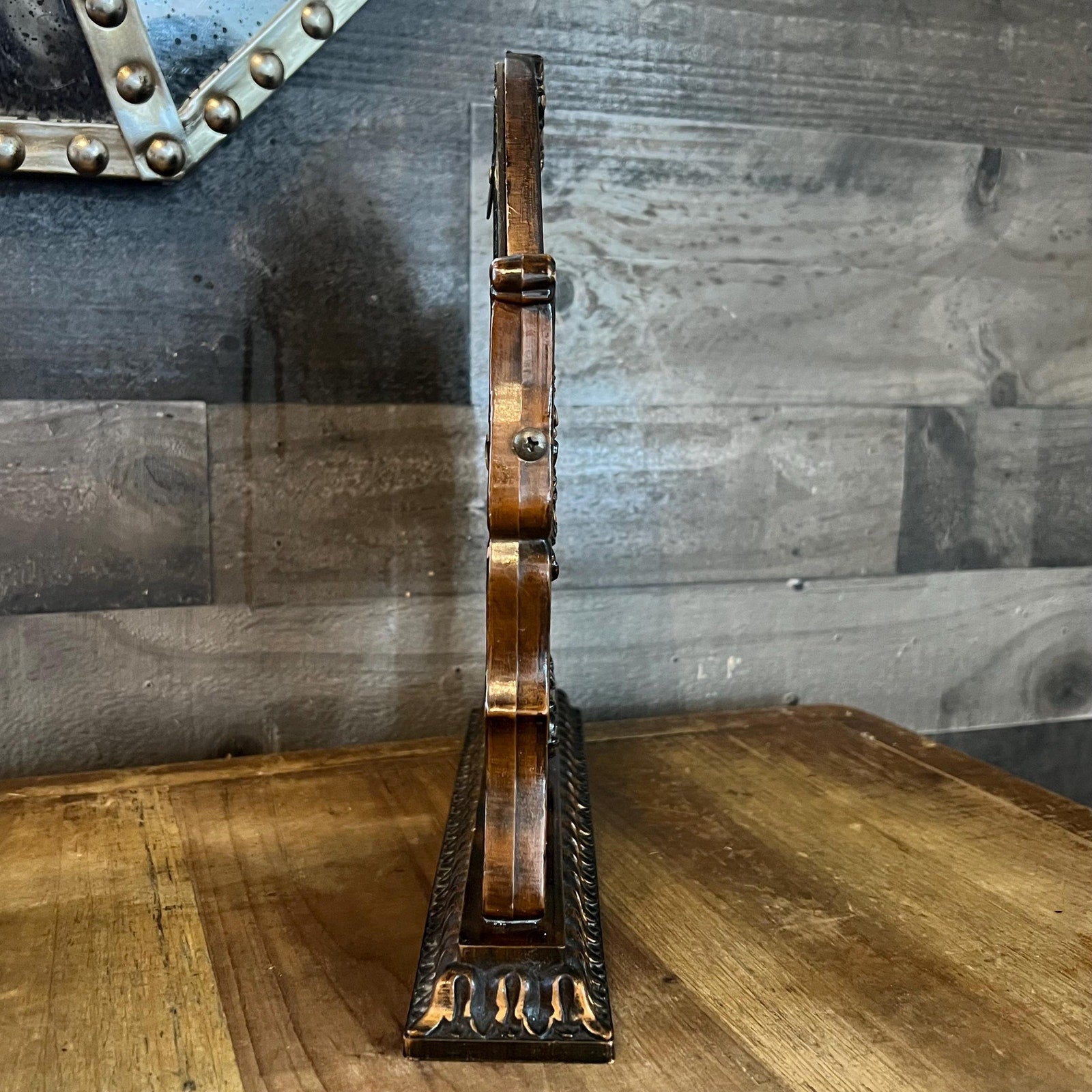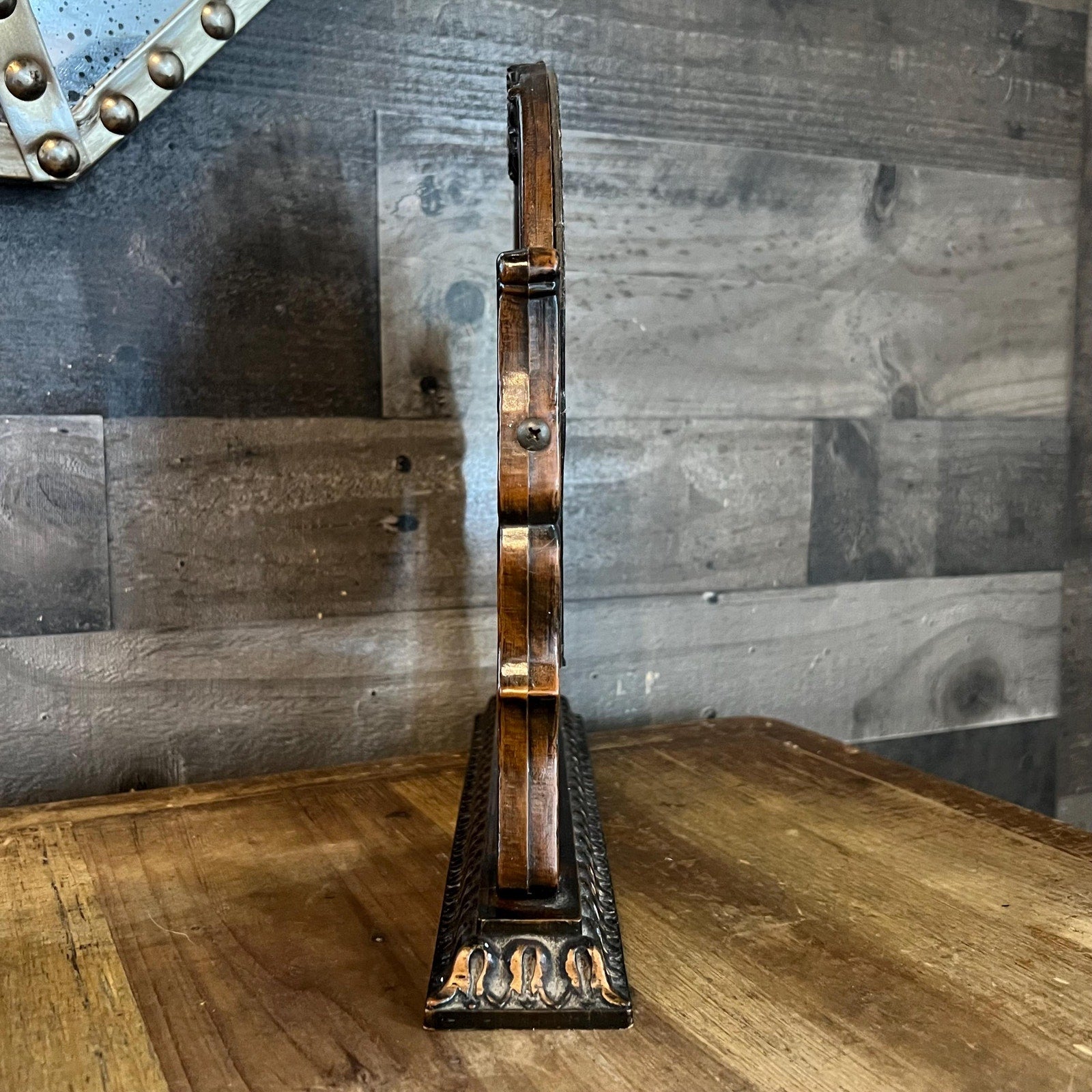 This Vintage Small Brown Victorian Baroque Style Mirror on Swivel will look amazing in your space! It’s wonderful for styling in your bedroom, closet, bathroom, office and more! Measures about 11 1/2 inch wide x 2 inch deep x 11 inch tall. The swivel loosens and tightens with the phillips head screw on each side of the mirror stand