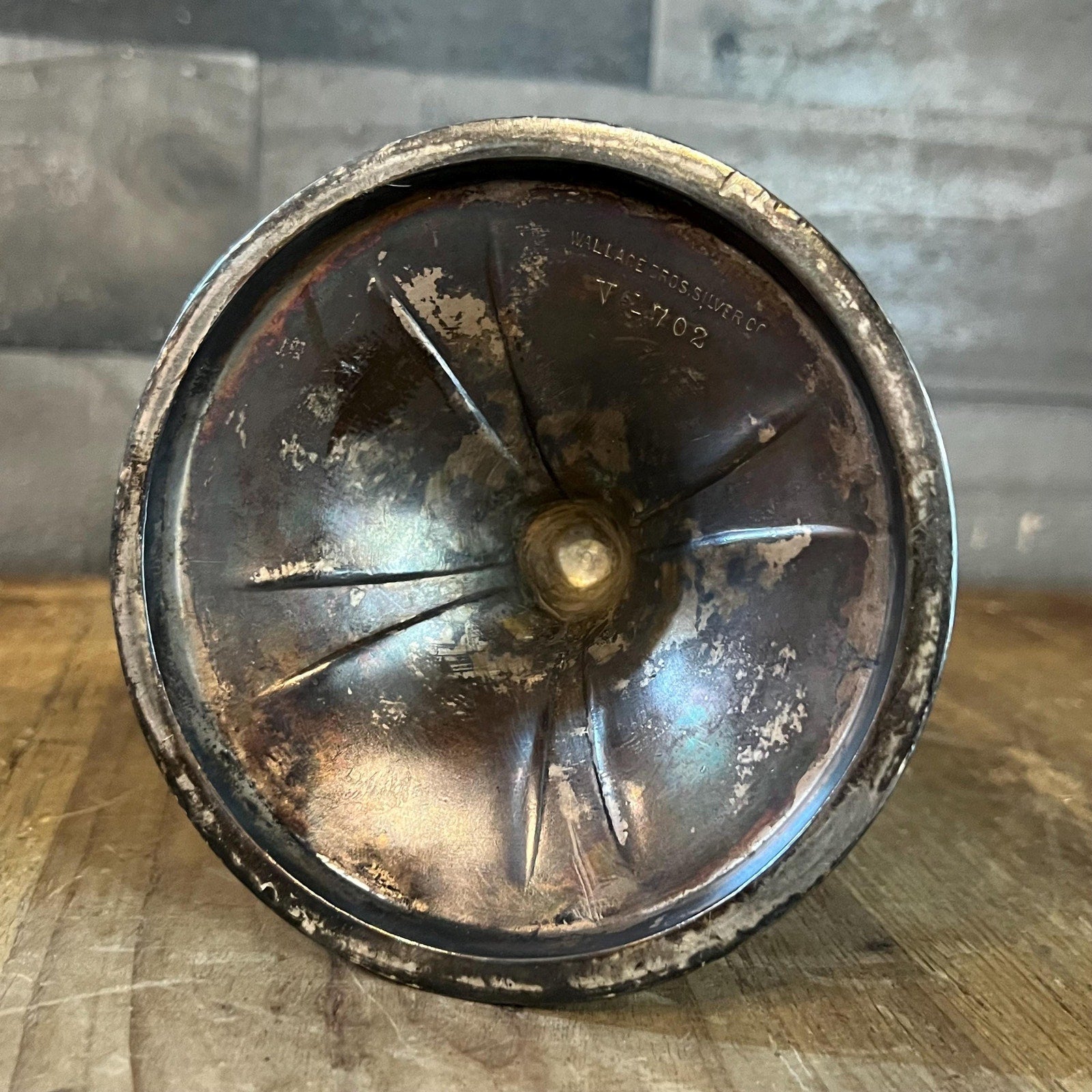 This Vintage Wallace Bros Silver Co Silverplated Candlestick Holder will look lovely in your space! Perfect for styling on your tabletop, desk, vanity, dresser, countertop, console table and more! There is an engraved monogram on one side - pictured - appears to be a K. You will absolutely love the character it’s aged look brings! Measures about 9 inch tall x 4 1/4 inch wide base. Marked V-702