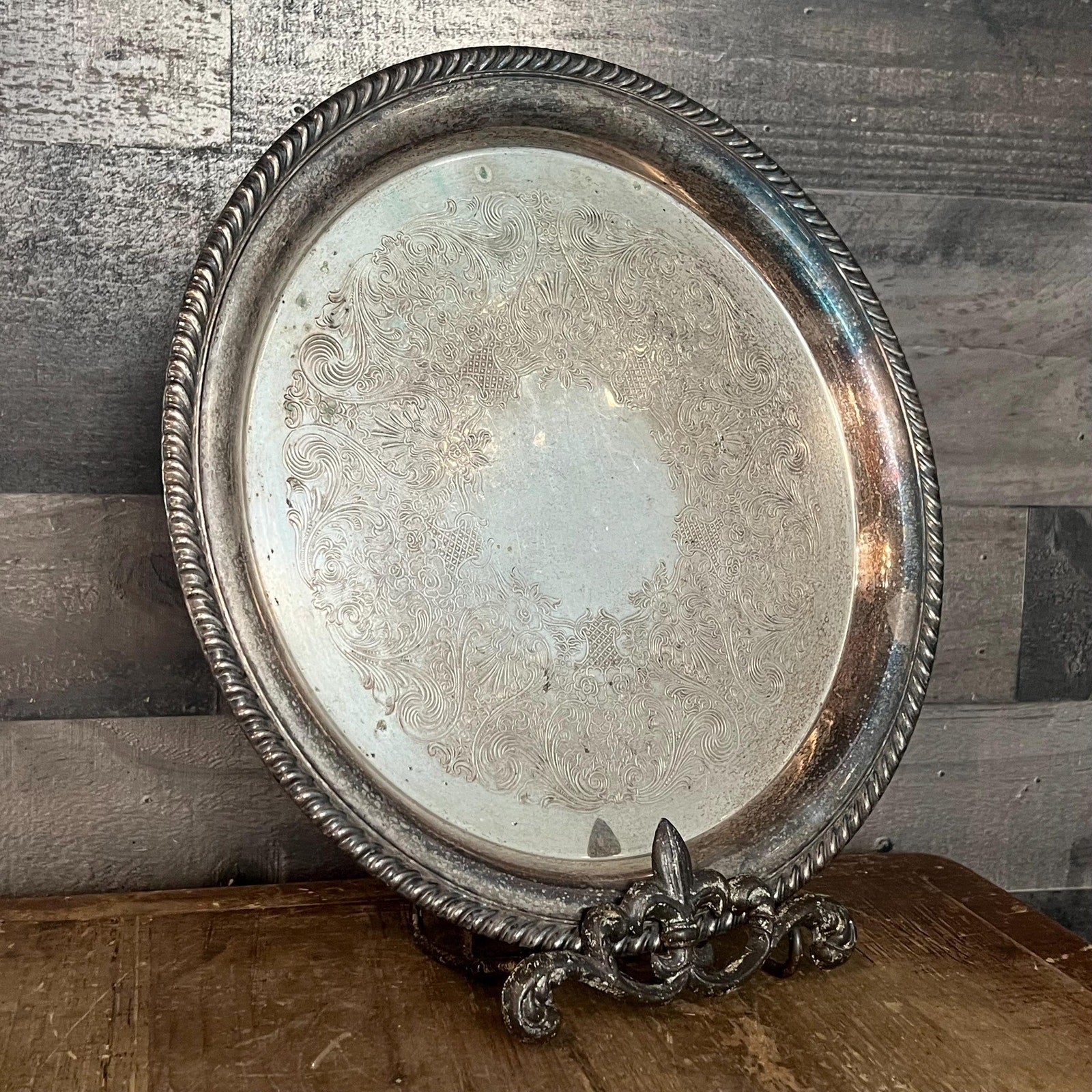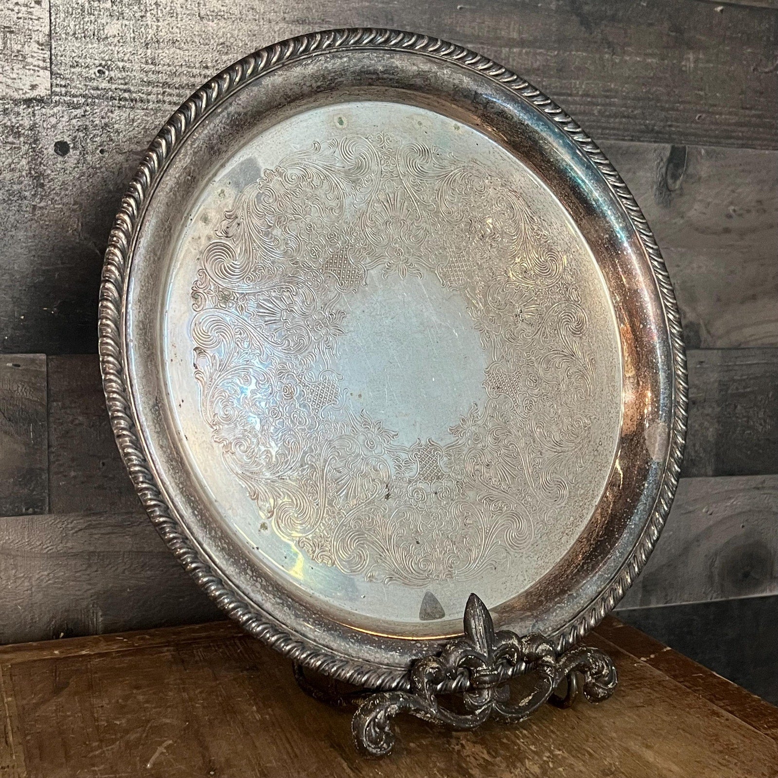 This Vintage WM Rogers Round Silverplated Serving Tray will look wonderful in your space! Perfect for decor and serveware purposes. Use in your hallway, entryway, bedroom, closet, dining room, bathroom, kitchen and more! Use as a table centerpiece, bar cart tray, perfume tray, charcuterie tray and more! Measures about 12 1/4 inch wide